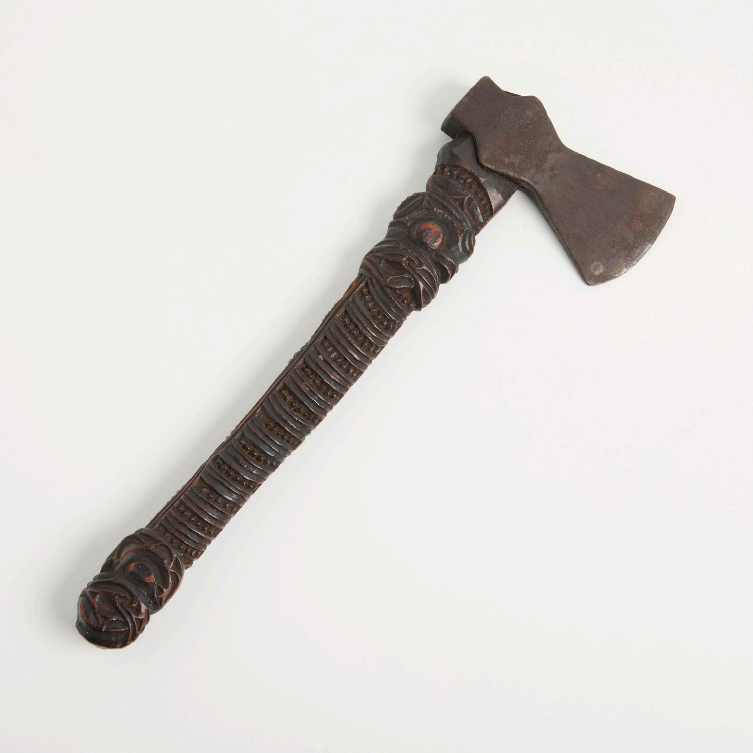 This 19th-century Patiti (short-handled axe) from Aotearoa features a finely carved wooden shaft, richly adorned with wheku (stylised ancestral faces) and rauponga (notched ridges with pakati patterning). The axe is mounted with a trade steel blade, during the early to mid-19th century, Aotearoa underwent profound transformation. As European traders, missionaries, and settlers arrived, so too did new materials including metal tools. Māori quickly recognised the utility of iron and adapted it into traditional forms. The Patiti is a product of this cultural synthesis, combining a European trade axe blade with a distinctively Māori carved haft, maintaining indigenous values of craftsmanship, genealogy, and status. L355 W25 D122mm Y13223*