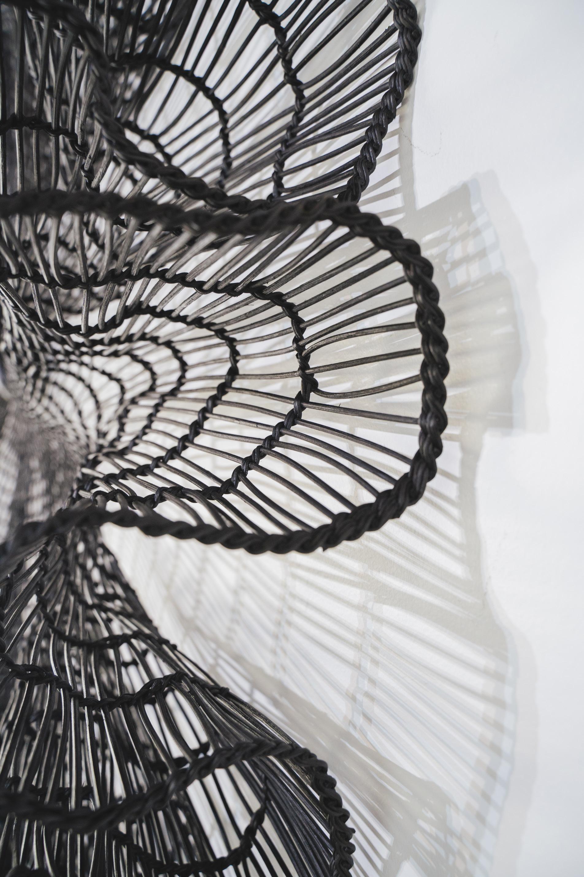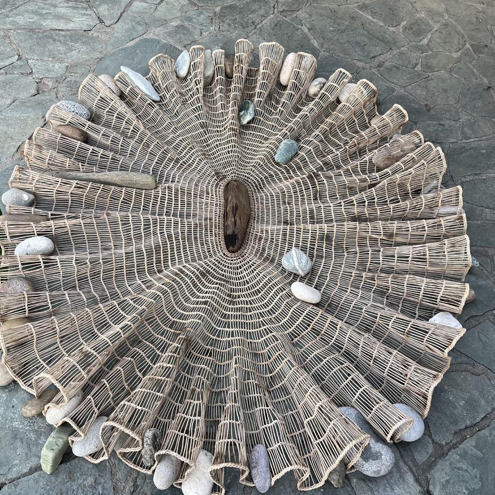 95 Jasmine Clark, Tide Catcher (detail), 2025, woven rattan reed, charred driftwood, 200 x 170 cm