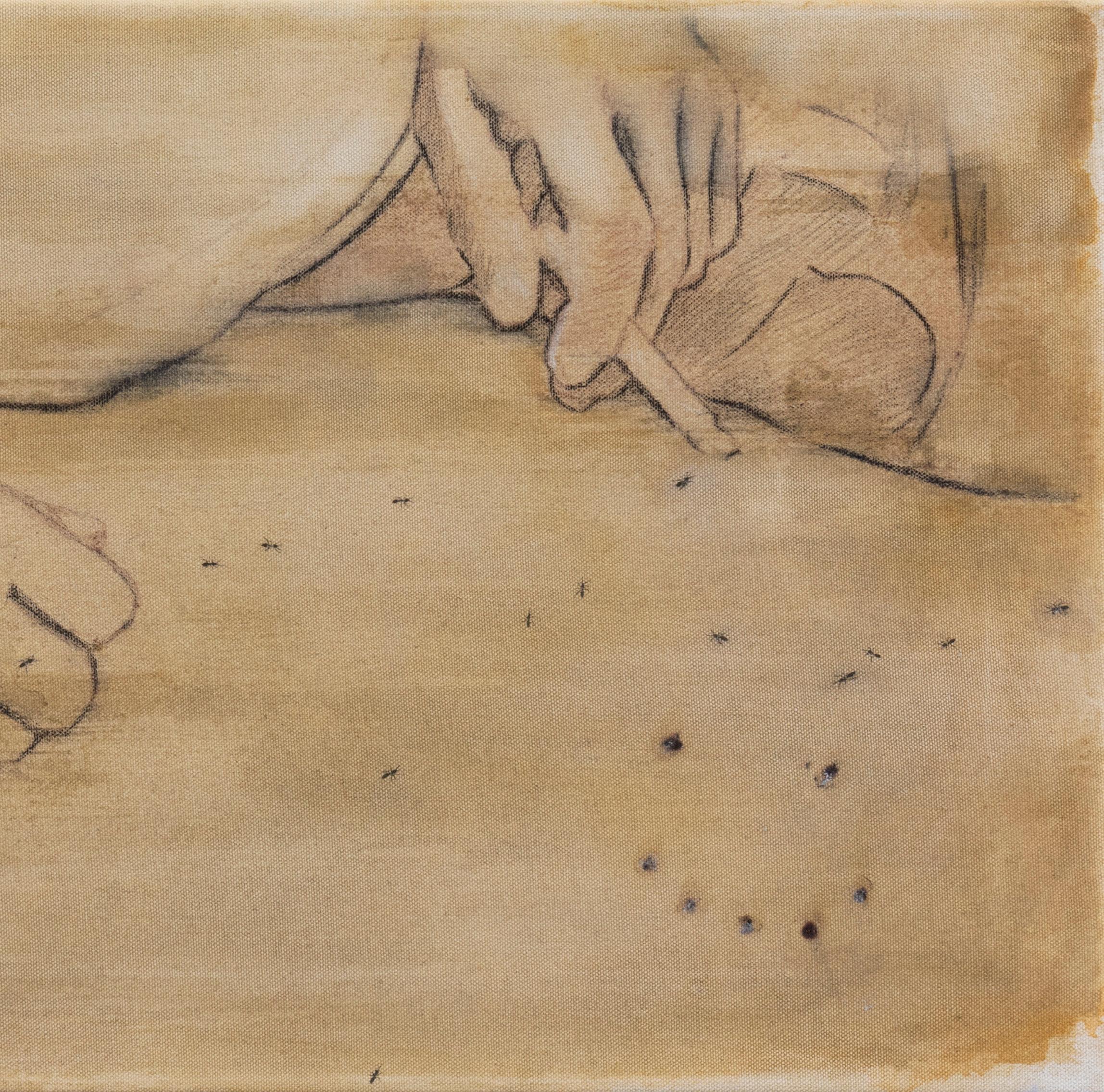 In Nat Tozer’s Observations of the Ground Through Canvas (ongoing), once-buried canvases map their participation in this life cycle beyond white gallery walls. Arrested mid-decomposition, they attest to the continual existence of an underground conversation between soil, microbes, insects, warmth and root systems. This chattering continues below our feet. In one late-afternoon message, Tori Beeche compares the form of the work to an altarpiece and my memory invokes Mary, Untier of Knots, a once-obscure Baroque painting of the Virgin Mary unknotting a long white ribbon. In my mind, she ties, unties and reties the ribbon as it gradually frays and softens to the same tone as Tozer’s unearthed artefacts.