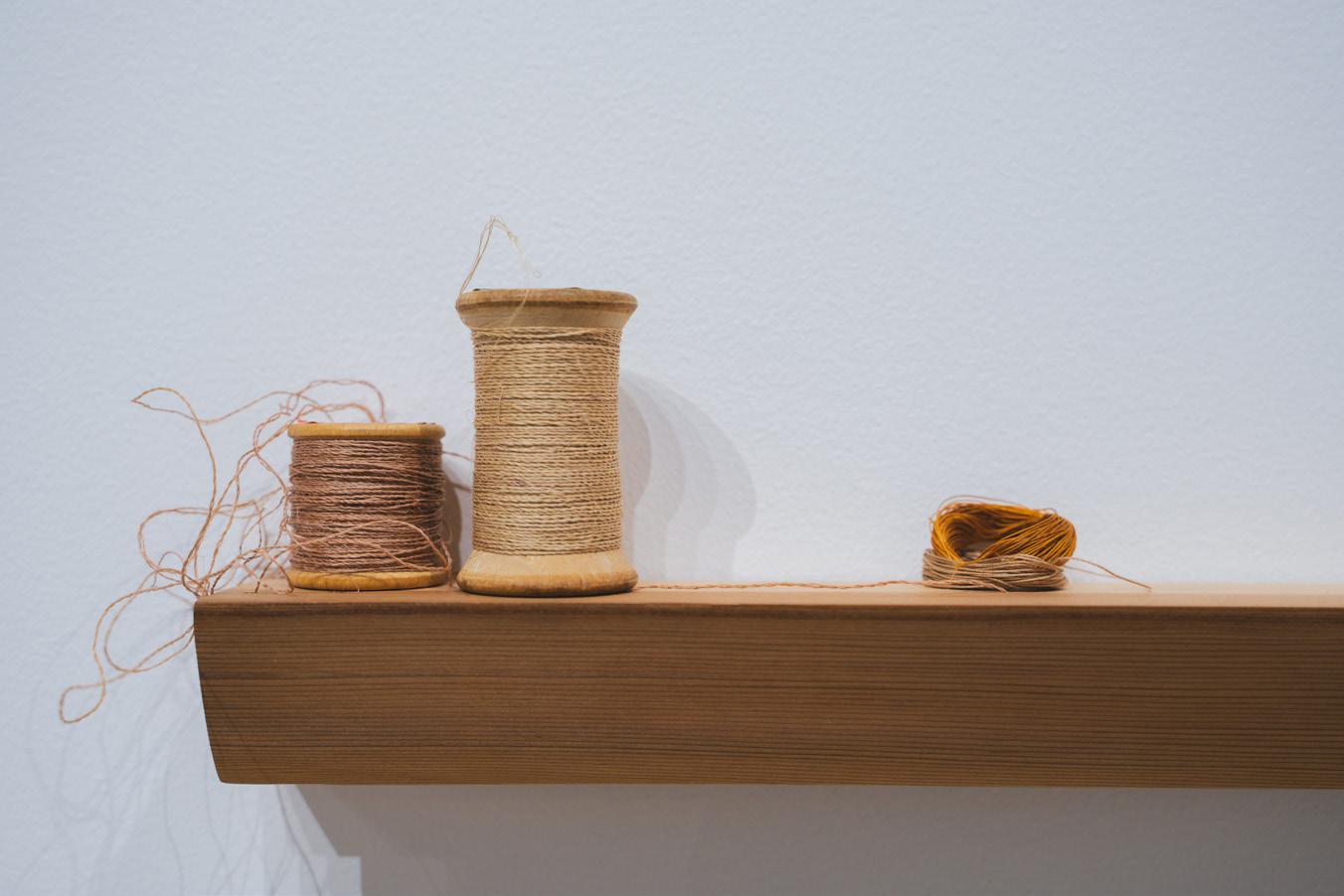 p. 96 Michelle Mayn, Muka & Reel, installed with Rachel Hope Peary, 2024–ongoing, cedar, muka (processed harakeke fibre; NZ Flax, Phormium tenax), wooden reel and wooden thread holder, muka dyed with guava berries and leaf, alder cone, wharariki pod and seed, harakeke pod and seed, tanekaha, 3.4 x 3.4 cm each, installation dimensions variable