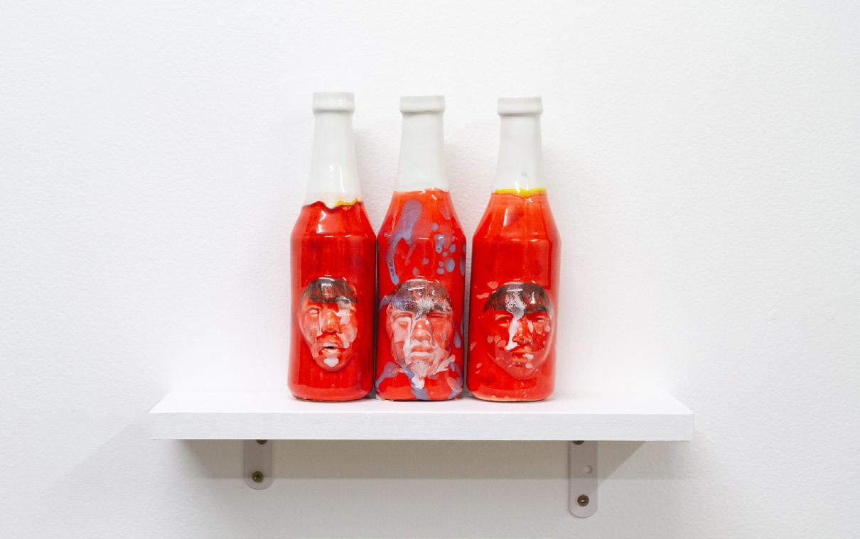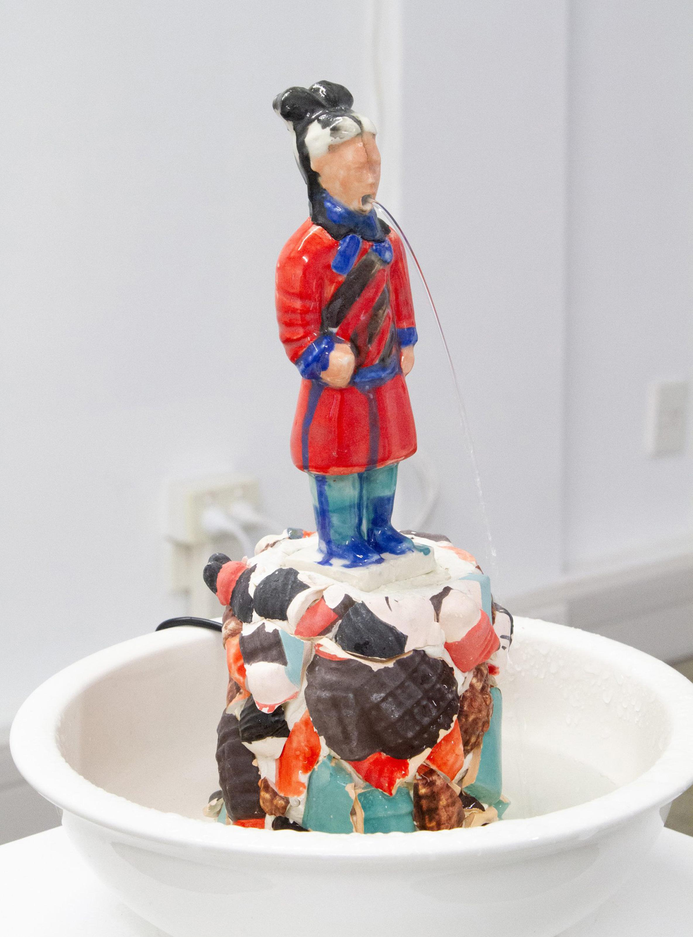 Elsewhere in the exhibition, porcelain fountains shaped like the famed Terracotta Warriors, their faces eerily cast from Hu’s own, spew thin jets of water from their mouths. The grotesque loop of ingestion and expulsion stages a final refusal: not just of food, but of the consumability of the Asian body. The work echoes writer Kyla Wazana Tompkins’s framing of racialised eating practices under empire, where appetite becomes a mode of domination— and indigestion, perhaps, a form of resistance.01