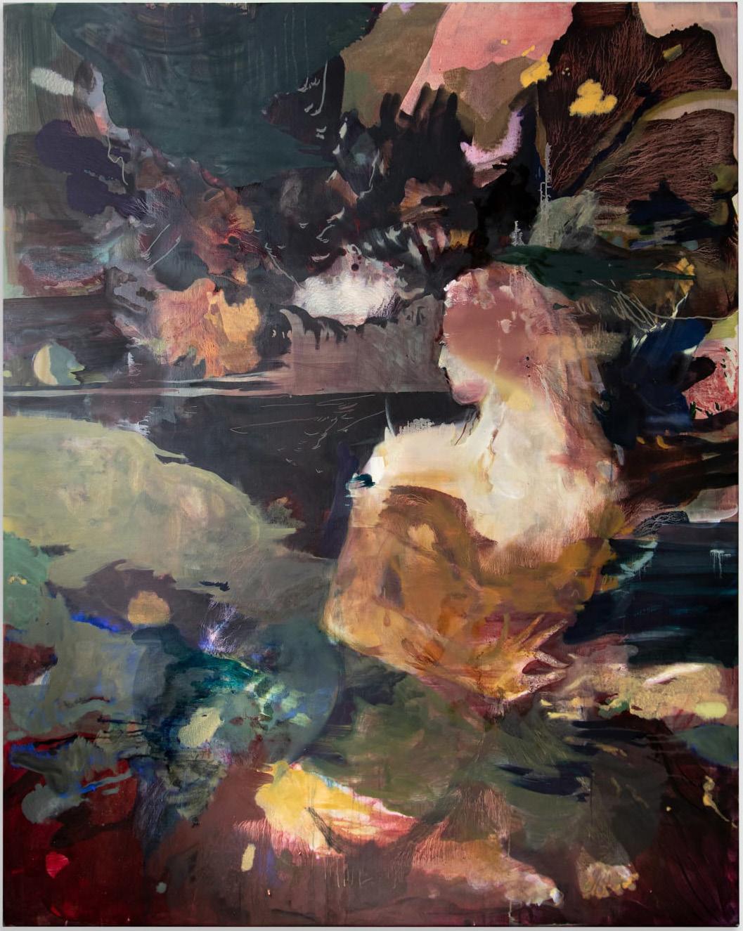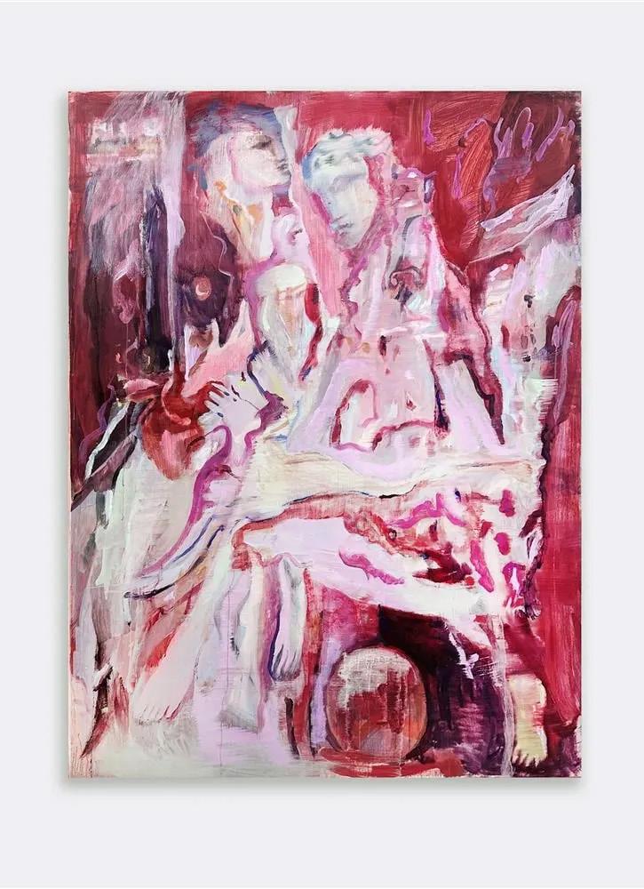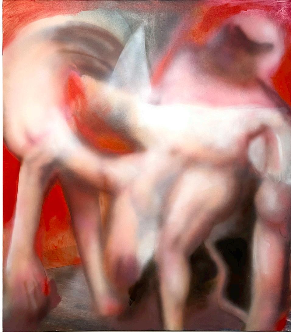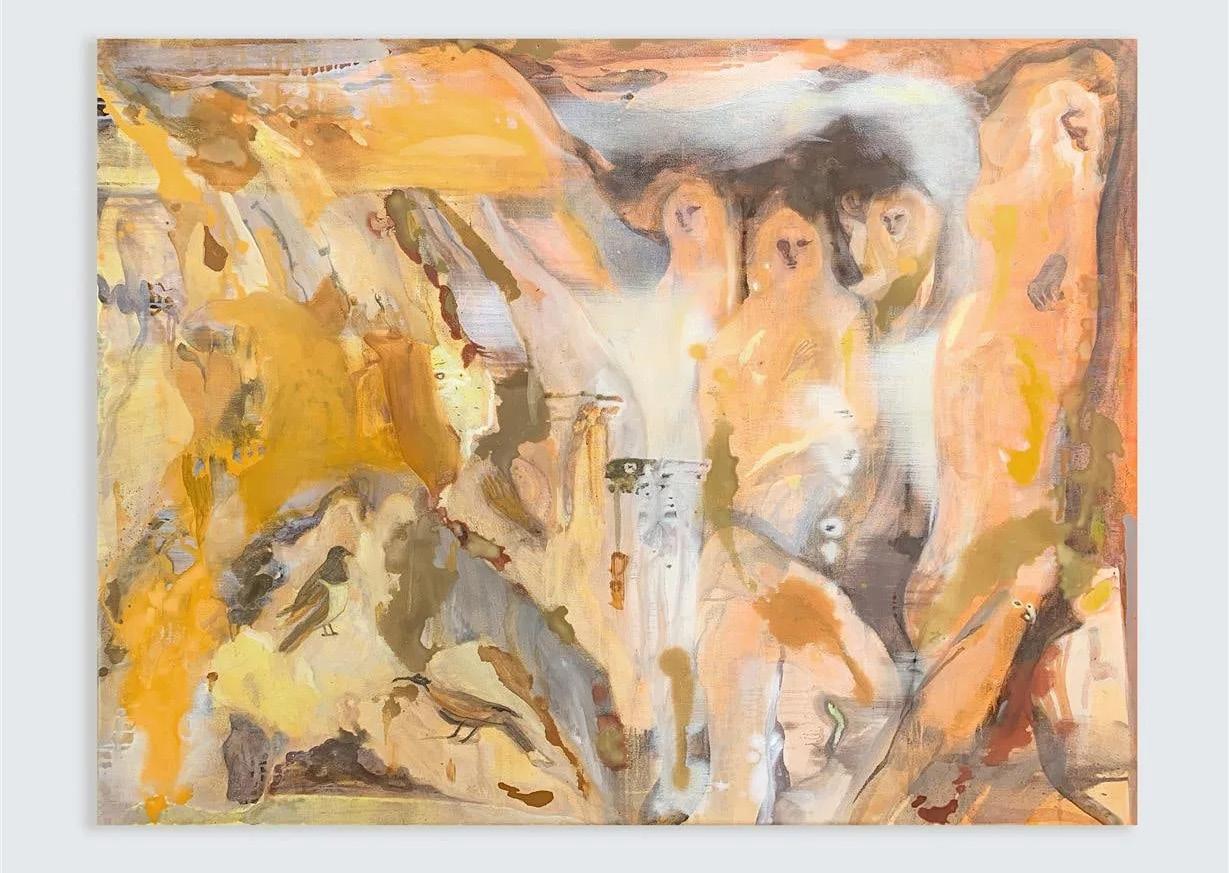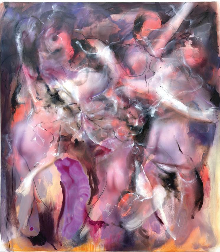“ Marks follows errant drips and spills of colour like a navigator charting celestial bodies. In earlier works, she moved swathes of oil paint across the canvas, teasing out classical profiles. More recently, those bodies remain, but they flicker in and out of focus like people in the background of a dream.”