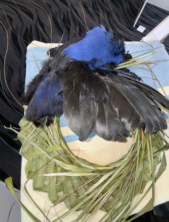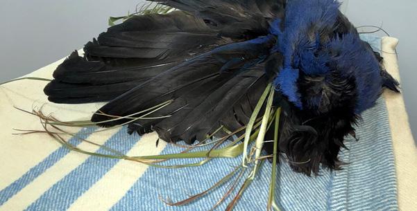 With Aroha MatchittMillar, the artist gestures at a species for whom European settlement heralded extinction. The huia and its feathers, while revered in pre-settler society, was ultimately collected into non-existence by the Europeans in mimicry of Māori adornment (sans the subtleties of mana they indicated). In lieu of huia (RIP) Matchitt-Millar uses pukeko on a flax-woven hat in the style of the time (four hundred years ago, give or take). It lays on top of the fridge, as if our checkered national history were a shared house and this hat something nonchalantly set down in the course of a day by its usurperowner (ownership of course being another myth; by a truer but more contested name, sovereignty).