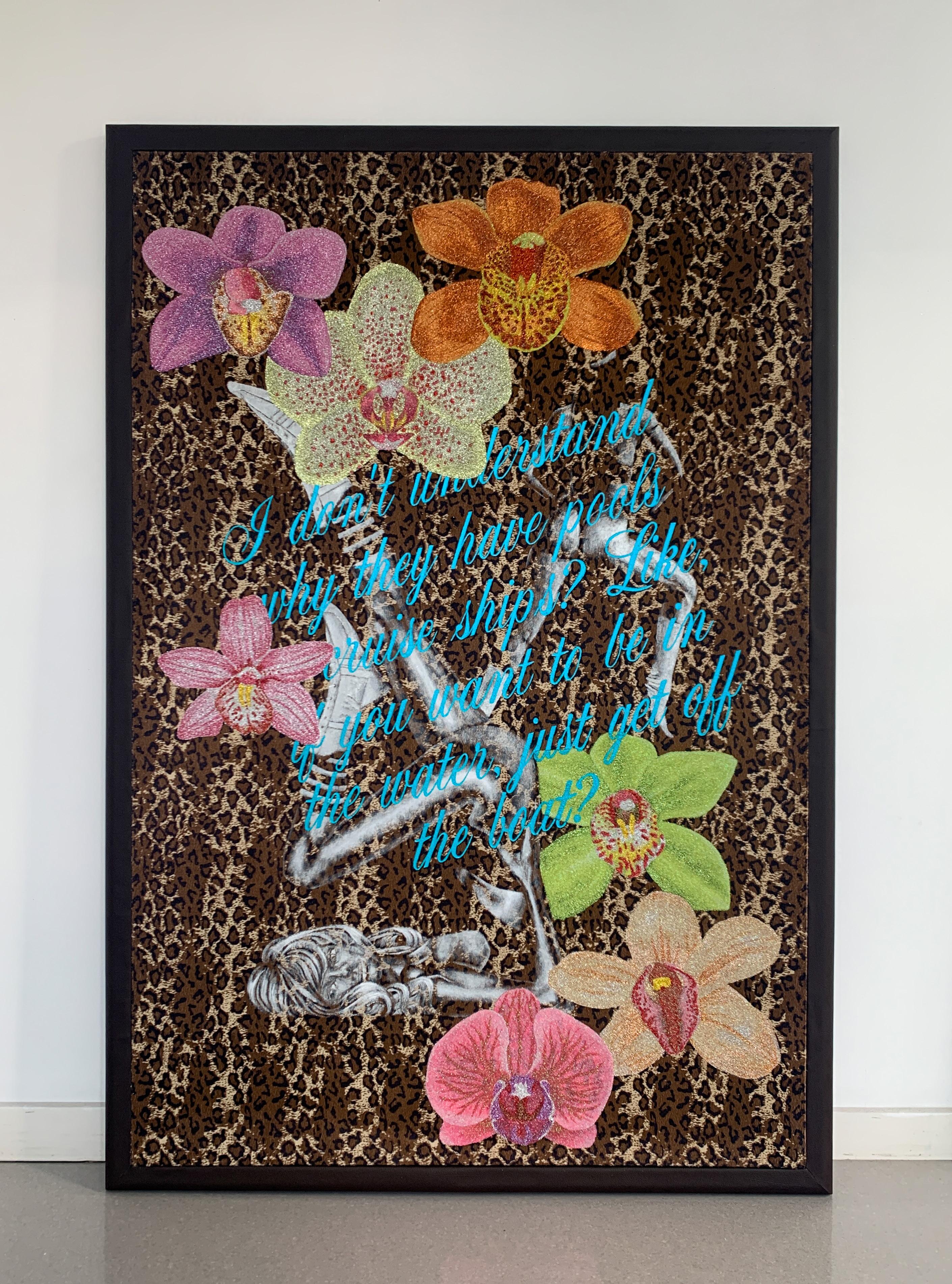 Walker-Smith cleans it up, pushes it through, lives it, and works it out. Working with plush velvet, animal print and leather, her works are a pastiche of the aesthetics she lives, finely painted over with text in a meme/RIP font. Her direct use of authorless online phrases sparks memories of those times; inside with the girls, inside with our crafts and our trinkets and our rinsed references.