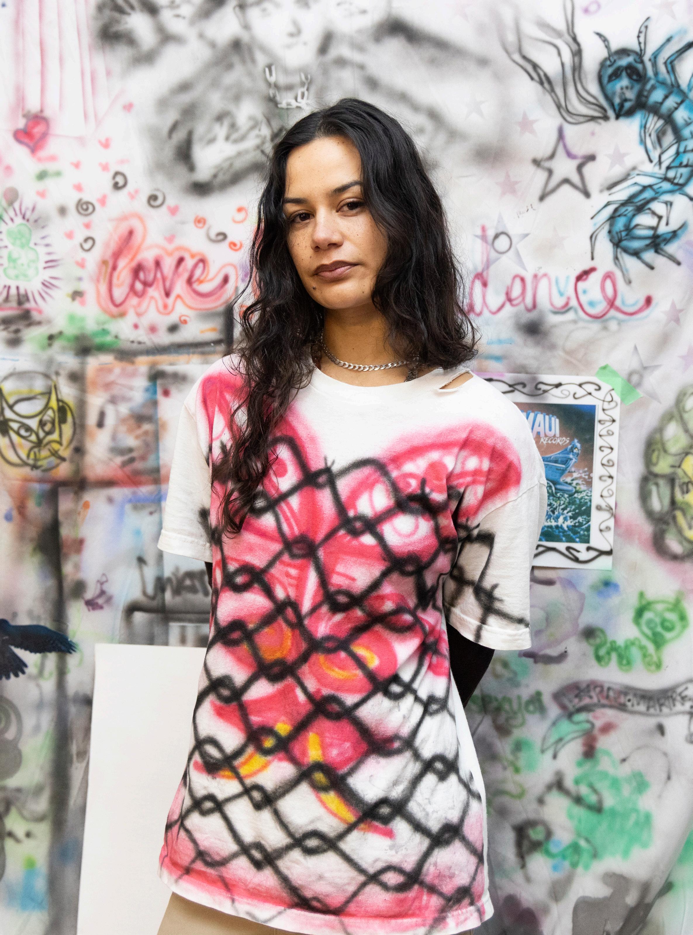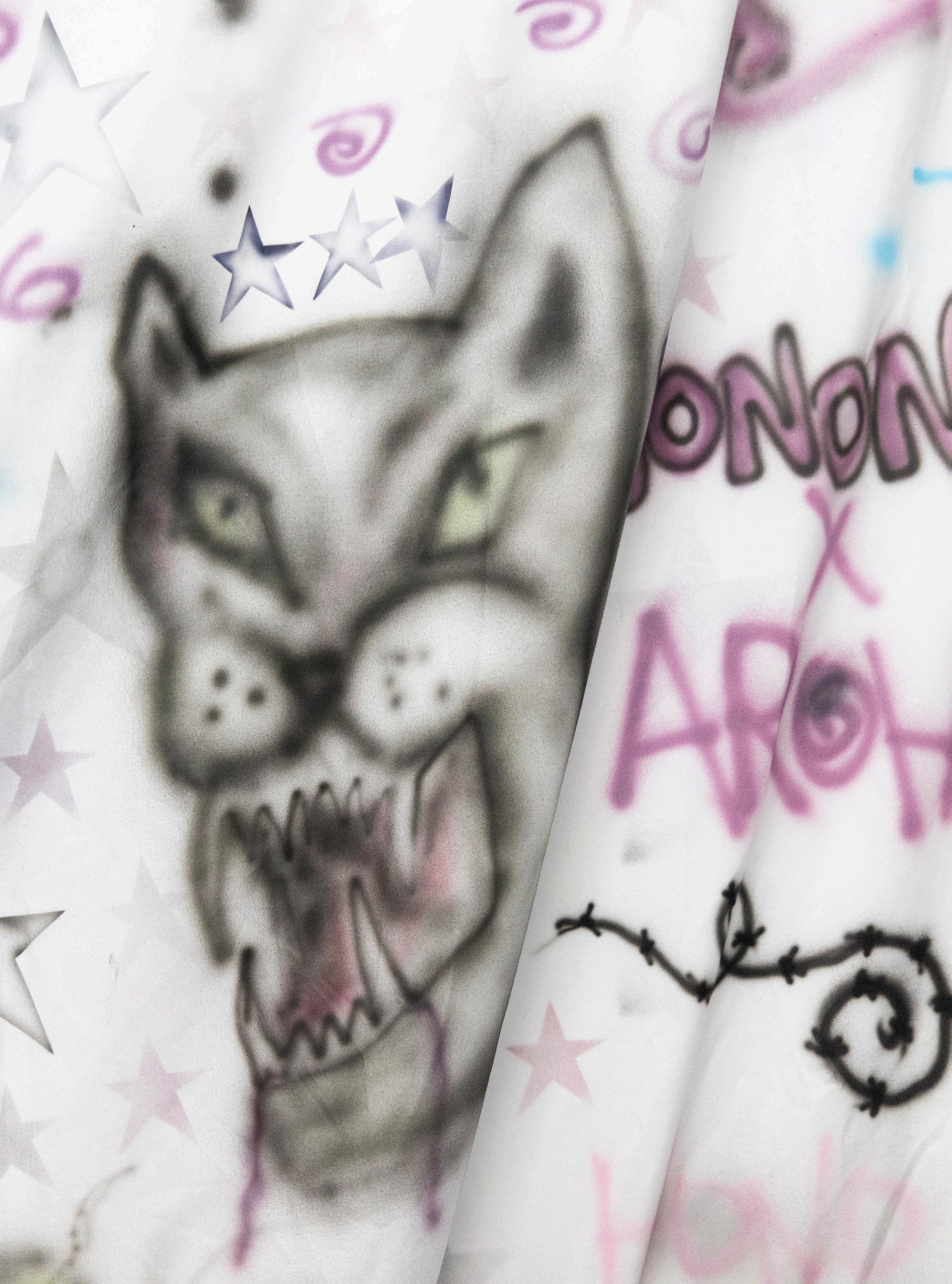 In Studio Huaki, Anahera-Jade’s recent exhibition developed during her residency at 'Parallax: reiterating forms of gathering', an Artspace Aotearoa programme led by curatorial intern Jingcheng Zhao, the artist opens her studio as a site of active making. Spraypaint cans litter the ground, postcards, scans and sketches are pinned to the walls, music videos are projected onto the walls, thumb- worn books are stacked on tables, and Anahera-Jade’s work scrawls across canvases, fabric sheets and paper. Travelling between stories of the past and future, te ao Māori, Samoa, the moon, and urbanity, the exhibition centres on the kupu Huaki—to uncover, to rise, and even, to attack. Here, AnaheraJade invites us to hold this word in mind as we step into her studio, where she shares her work in progress and the inspirations that guide her practice. AROHA. RAGE. HOPE. REST. RAVE.