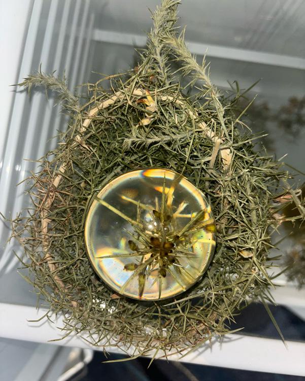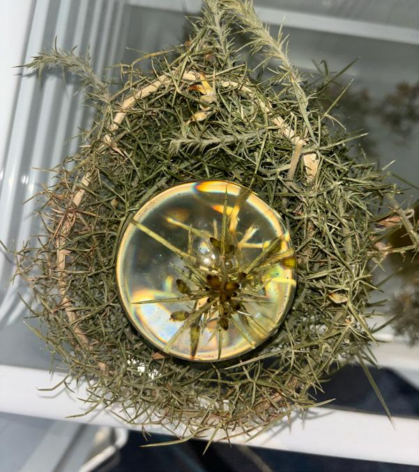Elvis Booth-Claveria and Jack Ellery playfully set gorse in aromatic balls of beeswax. Introduced by European settlers, the gorse plant is now an invasive species that significantly increases fire risk in the summer months. And yet its golden flowers and sweet botanic smell are indistinguishable from an NZ pastoral. The golden beeswax satirically proximates the artisanal candles of trendchasing décor.