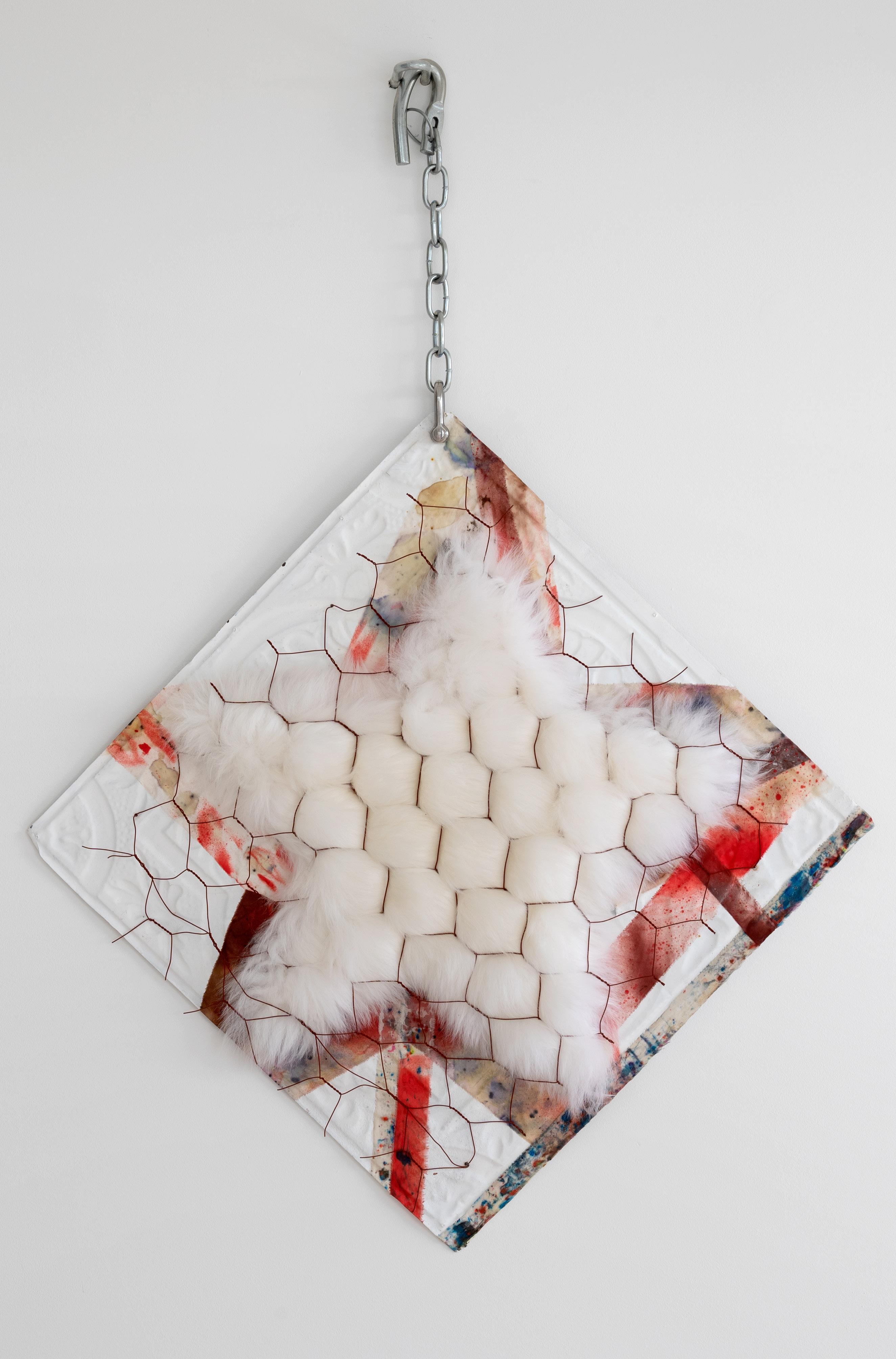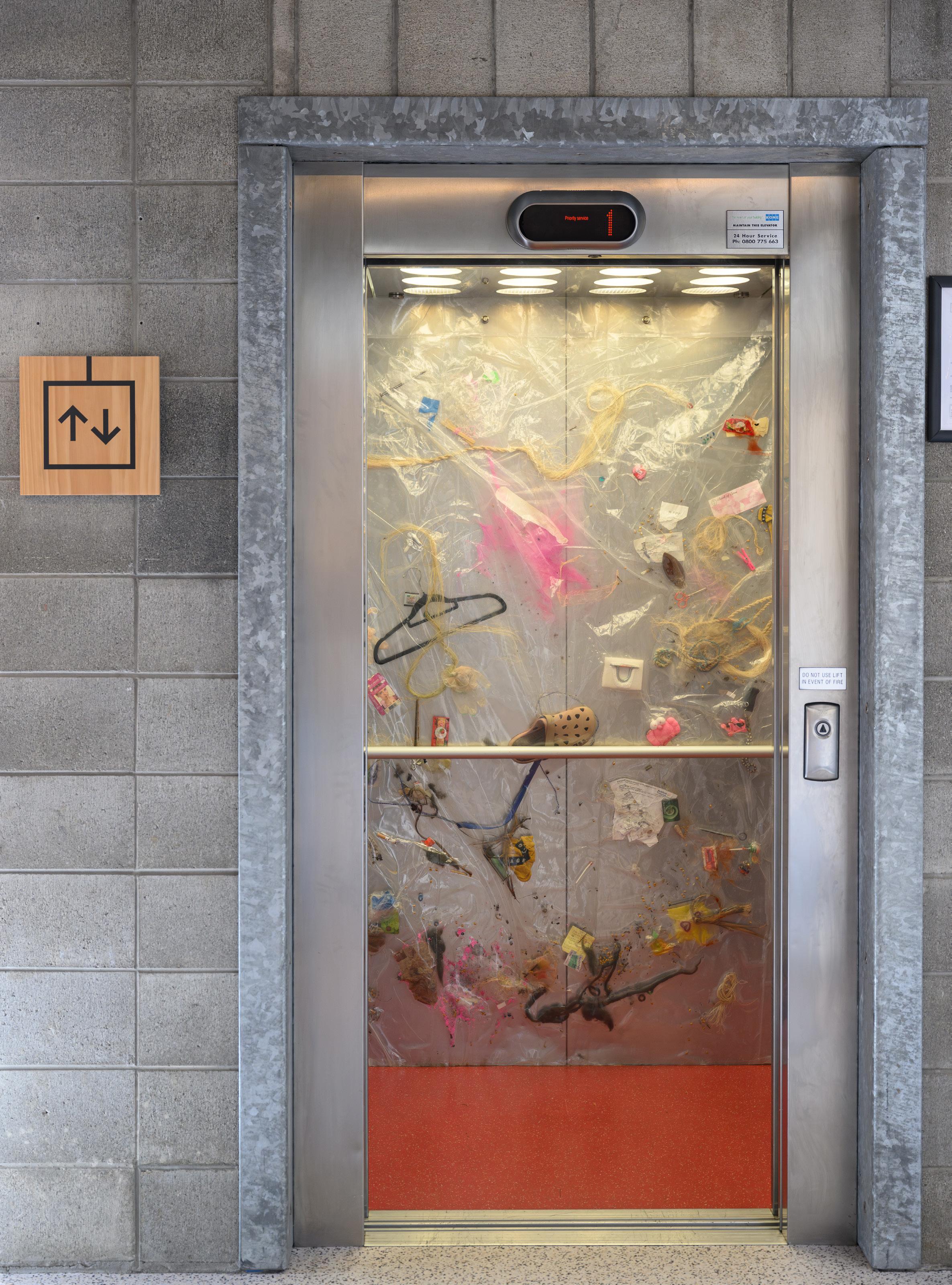 Tucked away in an elevator, cab-sous vide is viewed in transit between much larger exhibitions, in a kind of space that artists typically fear being assigned. In this confined nook, Abigail Aroha Jensen presents the keepsakes she carries in the folds of her purse. Vacuum-sealed and hung across the three walls of the elevator, the lift is transformed into her own secret grotto of prized possessions. Jensen gleans the dredges of mass-produced junk here to cobble together an ode to love, its transformative powers in the face of capitalist consumption, where there is no object that is ever enough.