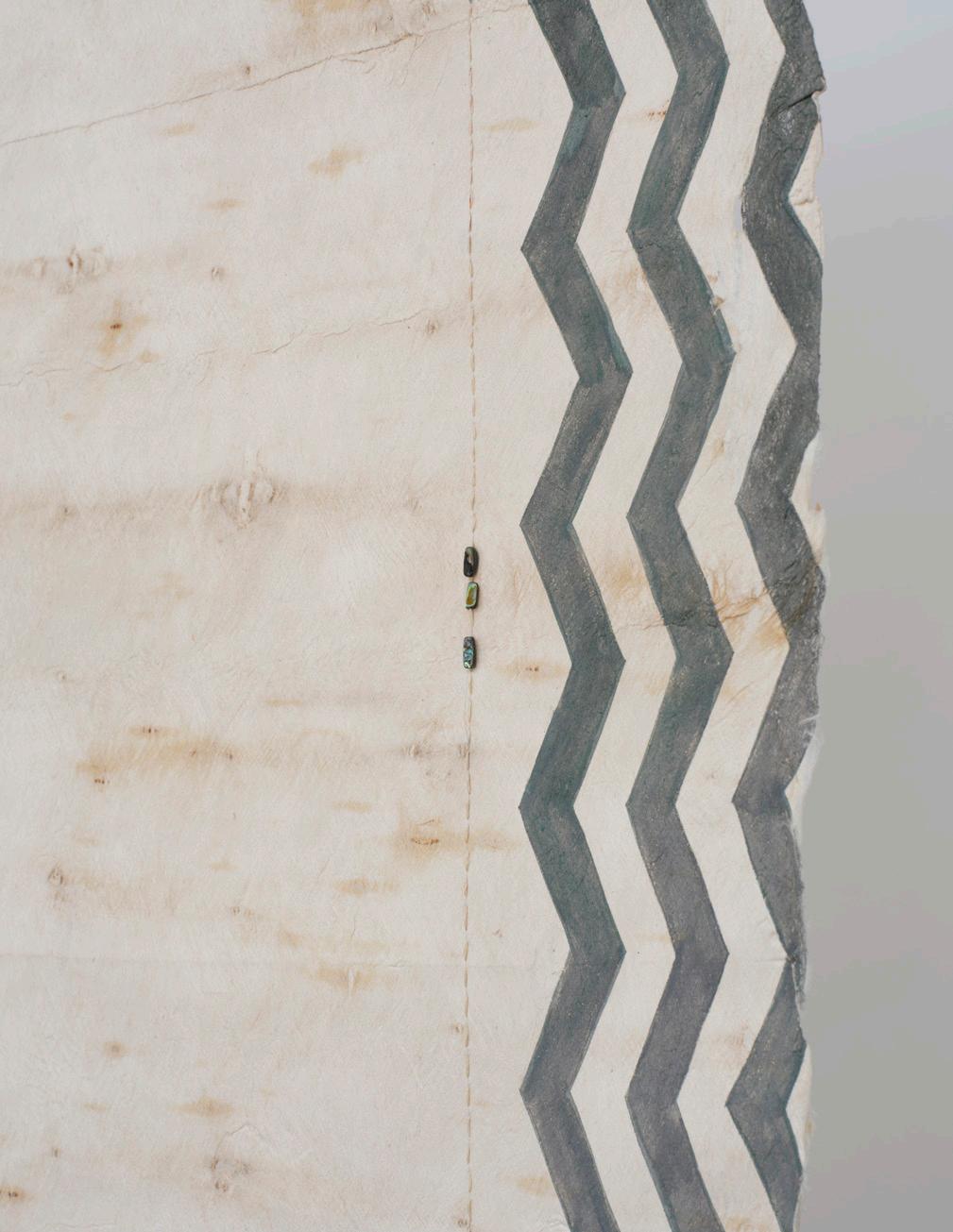 p. 119 Atarangi Anderson, Ngā mata moana (detail), 2025, aute, paua, muka, aumoana, 188.5 x 95.5 cm. Courtesy of the artist and Grace. Photo: Samuel Hartnett