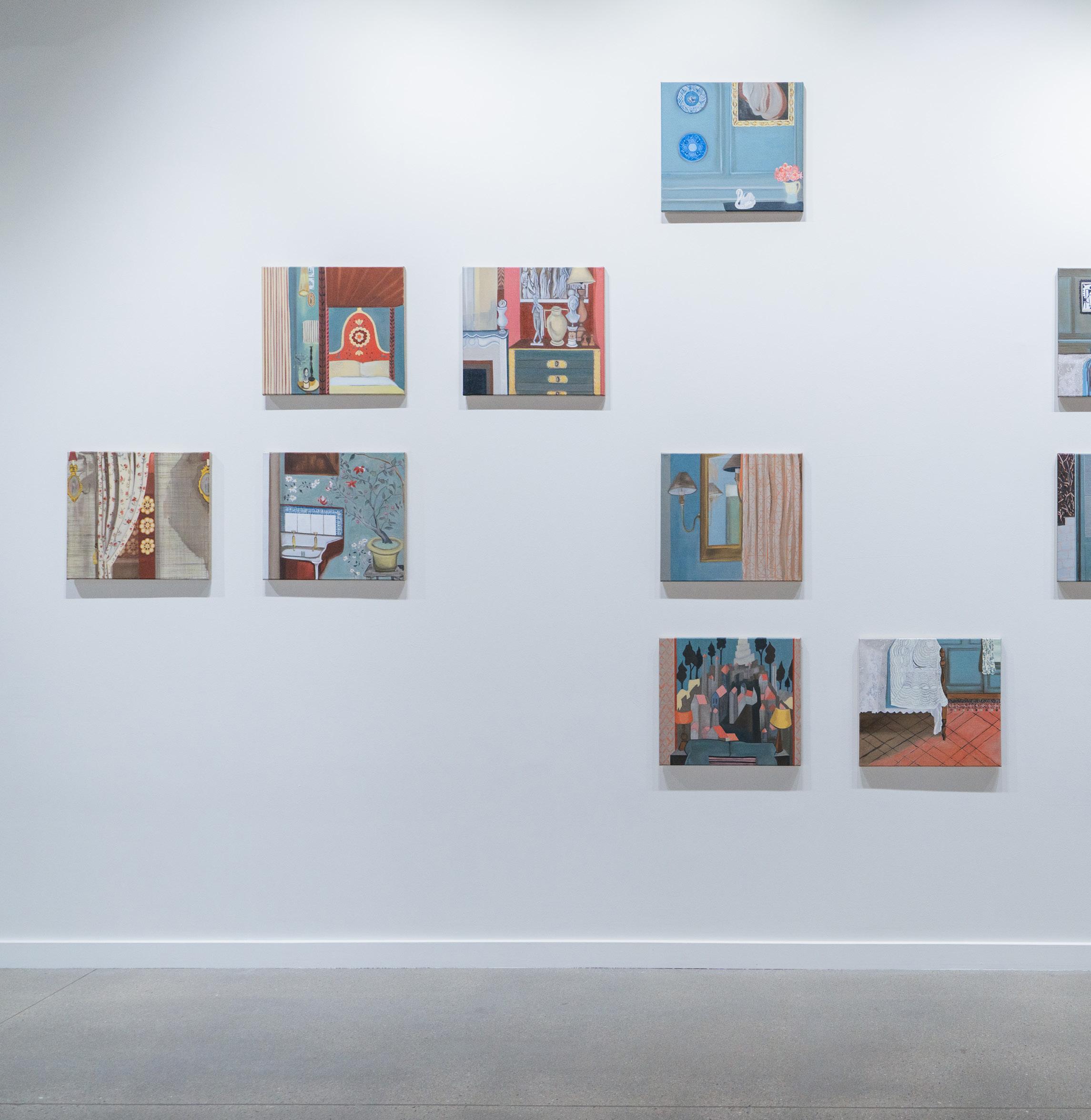 Tori Beeche’s paintings are also coded with inherited shapes and patterns, offering coy glimpses of imagined and remembered interiors that collage her own memories with her father’s recollections of his Norwegian childhood and images drawn from archives. Each composition operates off a grid that is gently delineated by the architecture of the picture space: in one instance the edge of a bluegrey door; in another the batten of a wall or a skirting board; later, a picture frame. Titled according to an established rhythm, each work is first inscribed as ‘Transitive Patterns’ before the reference or homage receives a nod in parentheses. By orbiting her own biography, Beeche navigates ways to approach a homecoming or shared familial histories.