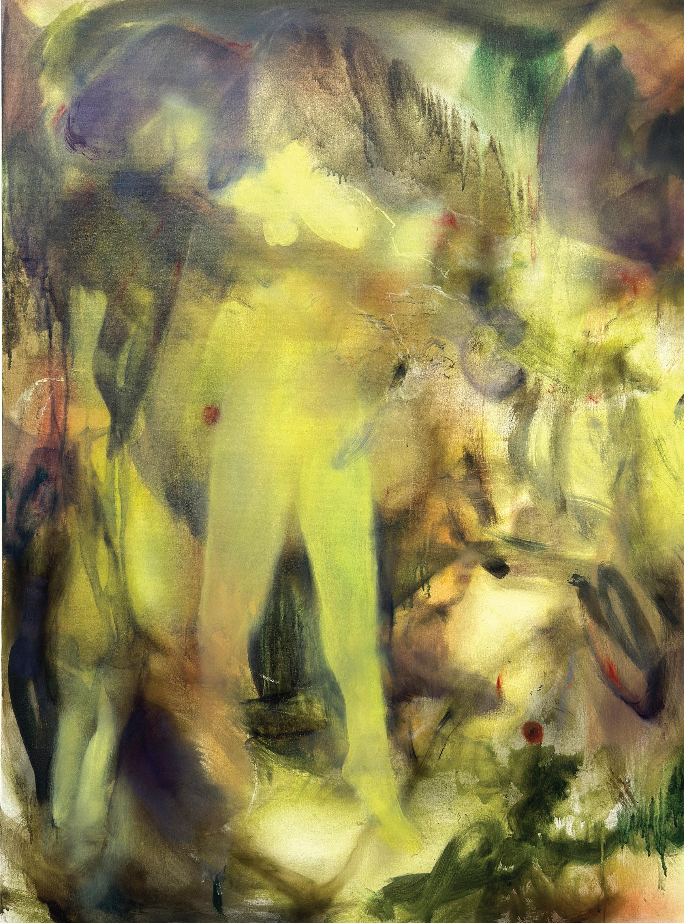 Marks follows errant drips and spills of colour like a navigator charting celestial bodies. In earlier works, she moved swathes of oil paint across the canvas, teasing out classical profiles. More recently, those bodies remain, but they flicker in and out of focus like people in the background of a dream. New spectral faces linger in the mists of Ever Before––just as easily the restless spirits of memory as they are the first faces of a new landscape. Other bodies are remarkably tactile, like the languid figure in As for