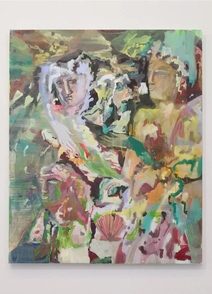 “ Marks follows errant drips and spills of colour like a navigator charting celestial bodies. In earlier works, she moved swathes of oil paint across the canvas, teasing out classical profiles. More recently, those bodies remain, but they flicker in and out of focus like people in the background of a dream.”
