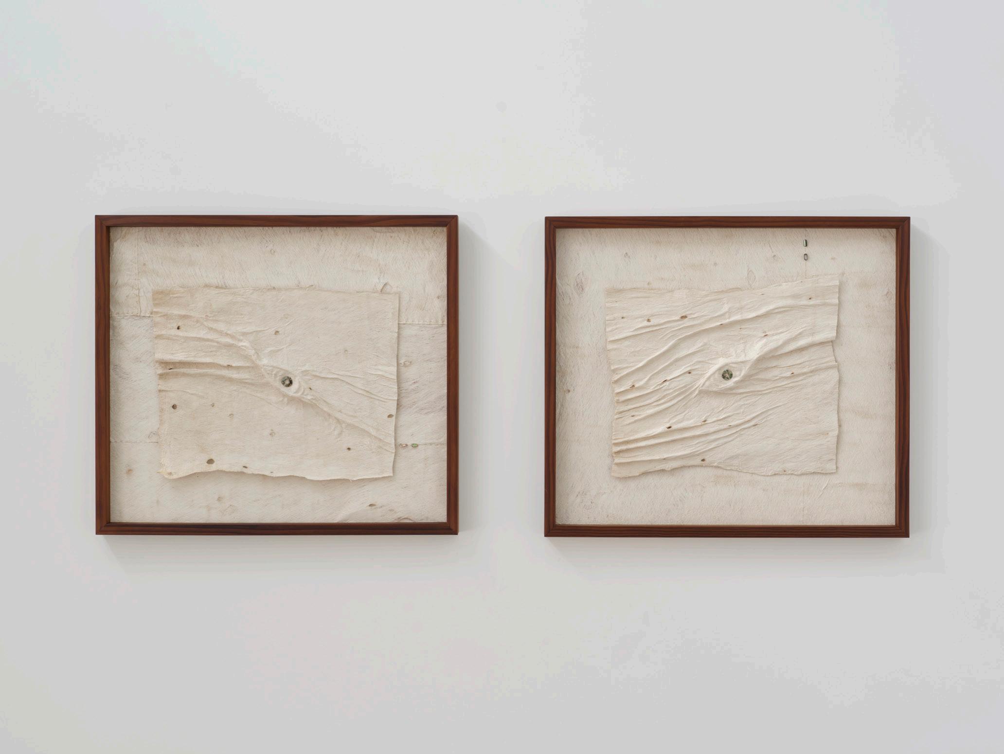 p. 117 Atarangi Anderson, Ngā mata aute, tahi and Ngā mata aute, rua, 2025, aute, paua, muka, framed in tung oiled pine, 58.5 x 51.5 cm each. Courtesy of the artist and Grace. Photo: Samuel Hartnett