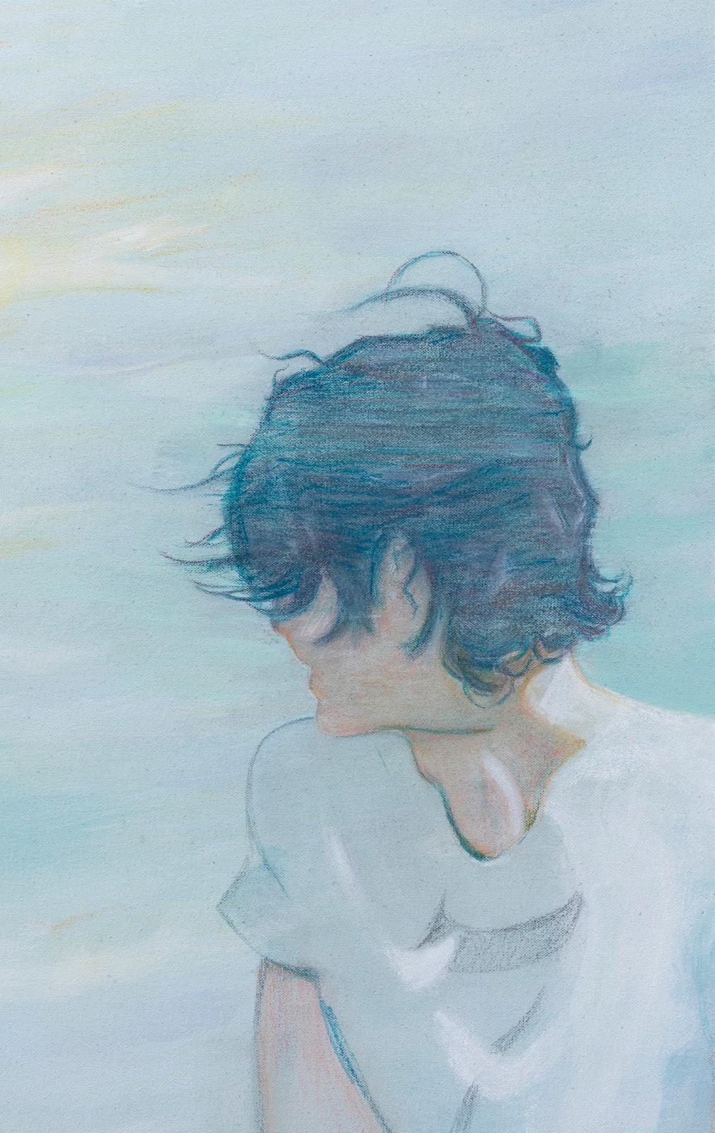 Marks’ paintings are acclimatising to the arid Melbourne climate. Her signature humid pastel tones have simmered into hot-house orchid and mulled wine in Clouds in Your Eyes, while a seafoam cold front sweeps through At Half Light. With the changing temperature, the surface of the painting fogs in response to the heat of the body; hands pressed against the glass. And hands are everywhere, appearing in most works in the series. They graze against the temple and make first contact with other bodies. The outstretched fingers of Begin Again find purchase in I Was Able to Go This Far, grasping onto a lone orange blossom. Touch helps to make sense of the unfamiliar, turns the abstract into the embodied, can ground and connect us. Sifting sand after the weeks at sea let us know that we have arrived.