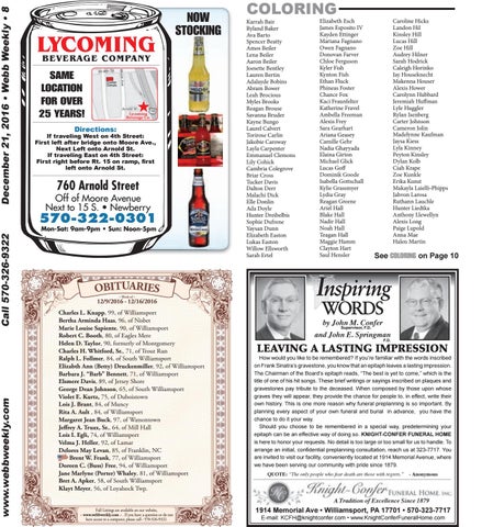 A Tradition of Excellence Since 1879 Full Listings are available on our website, ~ www.webbweekly.com ~ . If you have a question or do not have access to a computer, please call - 570-326-9322.