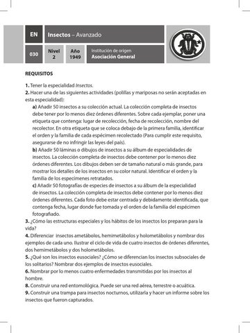 REQUISITOS 1. Tener la especialidad Insectos. 2. Hacer una de las siguientes actividades (polillas y mariposas no serán aceptadas en esta especialidad): a) Añadir 50 insectos a su colección actual. La colección completa de insectos debe tener por lo menos diez órdenes diferentes. Sobre cada ejemplar, poner una etiqueta que contenga: lugar de recolección, fecha de recolección, nombre del recolector. En otra etiqueta que se coloca debajo de la primera familia, identificar el orden y la familia de cada espécimen recolectado (Para cumplir este requisito, asegurarse de no infringir las leyes del país). b) Añadir 50 láminas o dibujos de insectos a su álbum de especialidades de insectos. La colección completa de insectos debe contener por lo menos diez órdenes diferentes. Los dibujos deben ser de tamaño natural o más grande, para mostrar los detalles de los insectos en su color natural. Identificar el orden y la familia de los especímenes retratados. c) Añadir 50 fotografías de especies de insectos a su álbum de la especialidad de insectos. La colección completa de insectos debe contener por lo menos diez órdenes diferentes. Cada foto debe estar centrada y debidamente identificada, que contenga fecha, lugar donde fue tomada y el orden de la familia del espécimen fotografiado. 3. ¿Cómo las estructuras especiales y los hábitos de los insectos los preparan para la vida? 4. Diferenciar insectos ametábolos, hemimetábolos y holometábolos y nombrar dos ejemplos de cada uno. Ilustrar el ciclo de vida de cuatro insectos de órdenes diferentes, dos hemimetábolos y dos holometábolos. 5. ¿Qué son los insectos eusociales? ¿Cómo se diferencian los insectos subsociales de los solitarios? Nombrar dos ejemplos de insectos eusociales. 6. Nombrar por lo menos cuatro enfermedades transmitidas por los insectos al hombre. 8. Construir una red entomológica. Puede ser una red aérea, terrestre o acuática. 9. Construir una trampa para insectos nocturnos, utilizarla y hacer un informe sobre los insectos que fueron capturados.