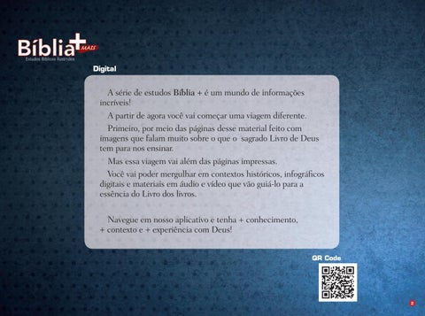 A série de estudos Bíblia + é um mundo de informações incríveis! A partir de agora você vai começar uma viagem diferente. Primeiro, por meio das páginas desse material feito com imagens que falam muito sobre o que o sagrado Livro de Deus tem para nos ensinar. Mas essa viagem vai além das páginas impressas. Você vai poder mergulhar em contextos históricos, infográficos digitais e materiais em áudio e vídeo que vão guiá-lo para a essência do Livro dos livros. Navegue em nosso aplicativo e tenha + conhecimento, + contexto e + experiência com Deus! QR Code