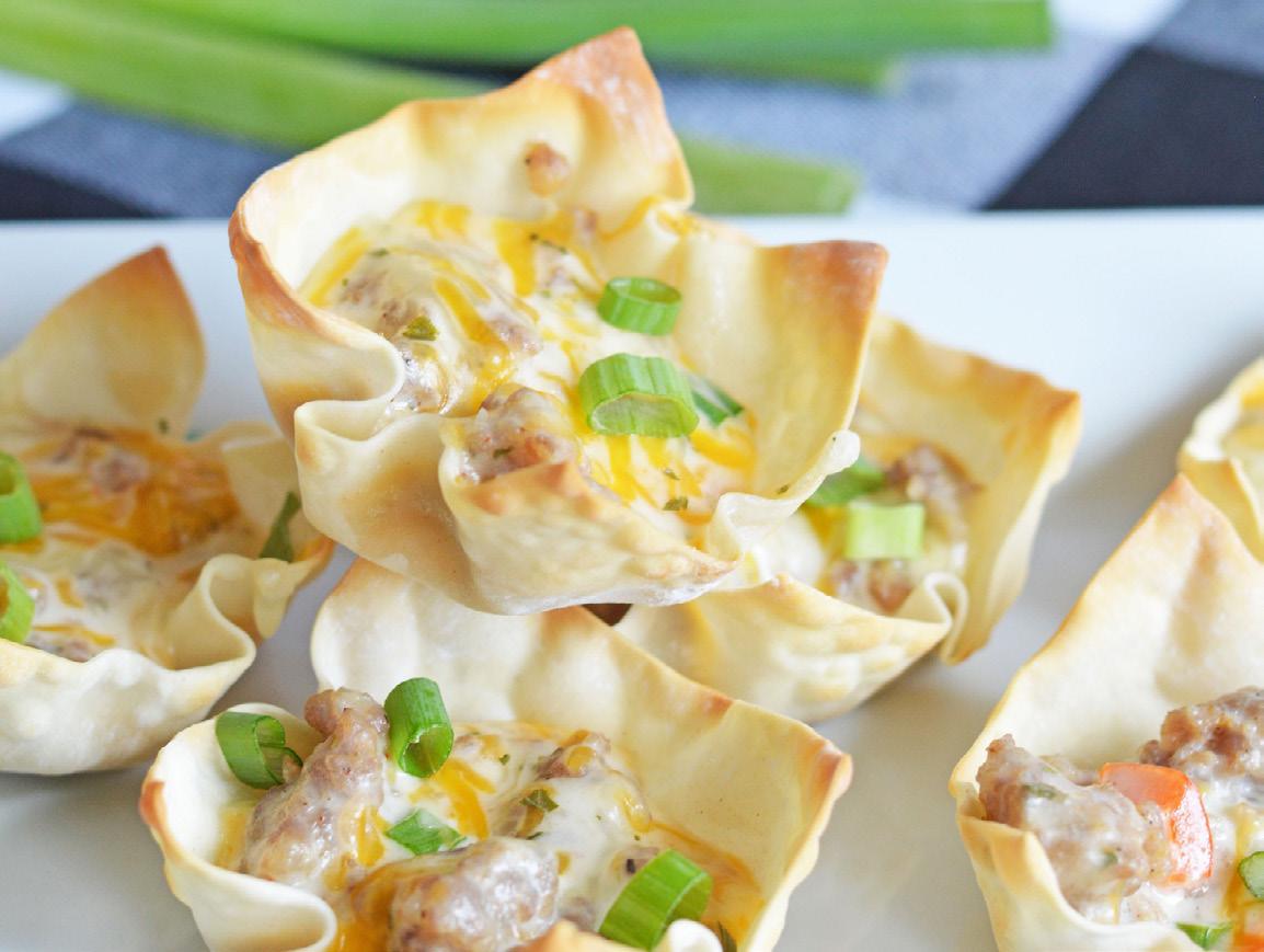 12. Spoon the cheesy ranch sausage mixture into wonton cups, about ¼ cup of mixture per cup.