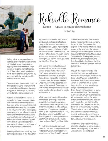 dubbed “Hitsville U.S.A.,” became the largest independent record company in the mid-70s. The museum has displays of the dozens of famous artists signed to the label over the years including such Motown greats at Martha Reeves and the Vandellas, Marvin Gaye, Stevie Wonder, Smokey Robinson and the Miracles, the Temptations, the Four Tops, Gladys Knight and the Pips, Diana Ross and the Supremes, and the Jackson Five. Though the weather may be cold, nautical lovers can see and explore Michigan’s maritime past at the Dossin Great Lakes Museum on Belle Isle in the Detroit River. The museum allows visitors to take the helm of a Great Lakes freighter or view an early passenger steamer’s grand salon. Enjoy Detroit in the outdoors at Meridian Winter Blast 2018. The three-day event kicks off January 26 and features winter activities such as the winter slide, live entertainment, and food for every palate. Free ice skating will be available on the Campus Martius rink, there will be marshmallow roasting, 50 entertainment acts will perform, and warming stations will help you snuggle up to your loved one when the air gets too cold. For more information, visit www.winterblast.com. Whether it’s for a weekend or a day, a time for relaxation or a time to play, Detroit has everything to see and do with someone special to you! 73