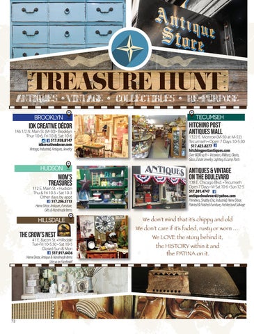 123 W. Maumee St. • Adrian 10-5 •Décor Sat 10-3 IDKMon-Fri Creative 517.920.4433 146 1/2 N. Main St. (M-50) • Brooklyn awesomefinds@comcast.net Thur 10-6, Fri 10-8, Sat 10-6 Home Décor, Unique Antiques, Primitives, 517.938.8147 Architectural Salvage, Decorative Collectibles idkcreativedecor.com Vintage, Industrial, Antiques, Jewelry