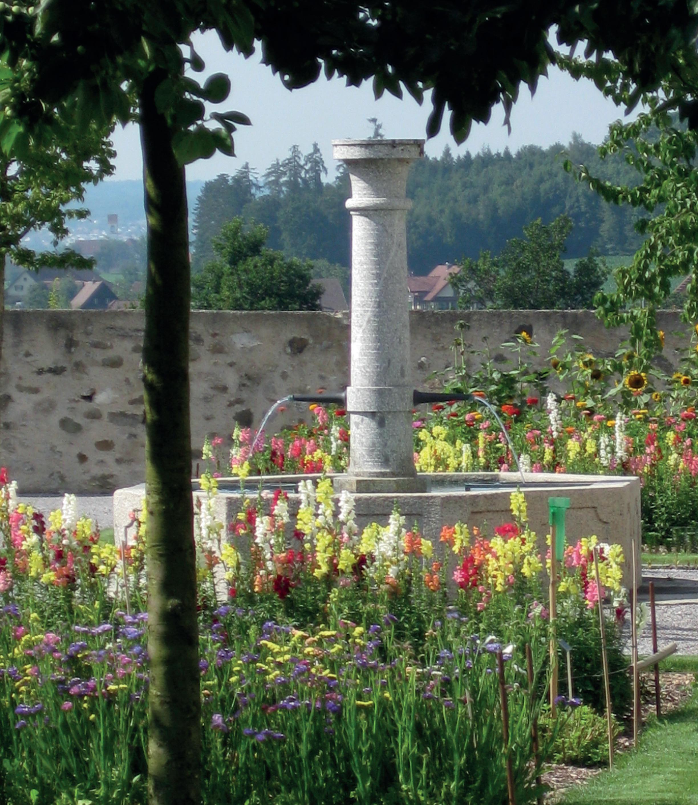 Nun blüht es wieder in den Gärten des Klosters Muri. Und das Wasser plätschert aus dem 2008 wiederhergestellten Martinsbrunnen mit der Figur von Martin von Tour, dem Klosterpatron von Muri. Insgesamt vier Gärten prägen diese Klosteranlage. Das im Jahre 1027 von den Habsburgern gestiftete und vom Mutterkloster Einsiedeln gegründete Kloster Muri gehört zu den wichtigsten barocken Klosteranlagen der Schweiz. Der Klosterhof ist die Eingangspforte für die Besuchenden. Von hier aus erreicht man den Konventgarten und den grossen Küchengarten. Früher befanden sich hier auch die zwei ehemaligen Apothekergärten, die jedoch im Zuge der politisch initiieren Klosteraufhebung 1841 verschwanden. «Der Konventgarten diente der stillen Erholung, der Kontemplation, dem Gebet, dem Gespräch, der Naturbetrachtung und der gärtnerischen Arbeit», erklärt Peter Paul Stöckli. Der neben dem Klosterhof liegende Konventgarten übernimmt in seiner heutigen Gestaltung die ursprüngliche Gliederung in drei etwa gleich grosse Gartenteile, ausgerichtet auf die Sichtachsen der Klostergebäude. Die Beete wurden im barocken Stil bepflanzt mit Gehölzen, Buchsstauden und Zwiebelpflanzen, die jedoch herrlich zu blühen beginnen. Mit Ausnahme des Fürstengartens – des heutigen Pflegiparkes – wurden alle Gärten zwischen 1996 und 2004 durch das Wettinger Büro SKK Landschaftsarchitekten AG neu, aber im Geiste und in den Grundzügen der nach 1841 zerstörten Vorgängergärten gestaltet.