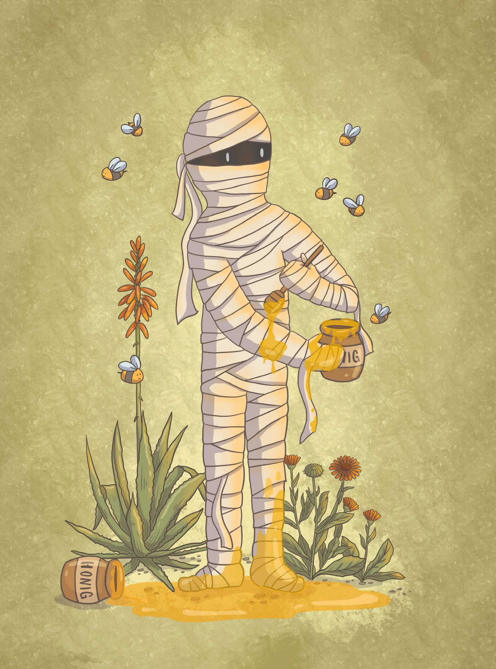 In Ägypten wurde unverdorbener Honig als Grabbeigabe aus der Zeit der Pharaonen gefunden, der also bereits mehrere Tausend Jahre alt war. Bis 2007 war es in der Schweiz nicht einmal vorgeschrieben, eine Mindesthaltbarkeit auf Honiggläsern zu deklarieren. Und weil Honig ein sehr lange haltbares Produkt ist, genügt es noch heute, einfach eine Jahreszahl anzugeben. Also «mindestens haltbar bis Ende 2024» zum Beispiel. Sie können aber auch wesentlich älteren Honig noch immer bedenkenlos geniessen, wenn er sauber verschlossen und trocken gelagert wurde und noch immer gut riecht.