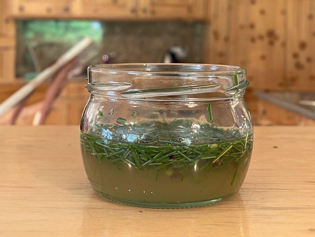 2 Die kleingeschnittenen Nadeln in das Glas füllen und mit Essig übergiessen, bis sie bedeckt sind.