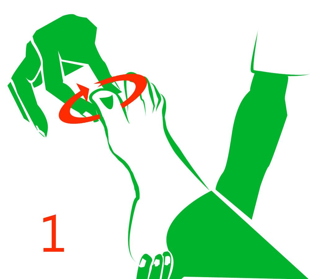 Nun gehen Sie nach und nach mit jeder Zehe gleich vor, wobei bei den anderen Zehen drei Gelenke bewegt werden können: Kreisen (jeweilige Zehe möglichst von den andern separieren), leicht ziehen, dann drehend ziehen, zum Schluss die Gelenke etwas auf und ab bewegen.