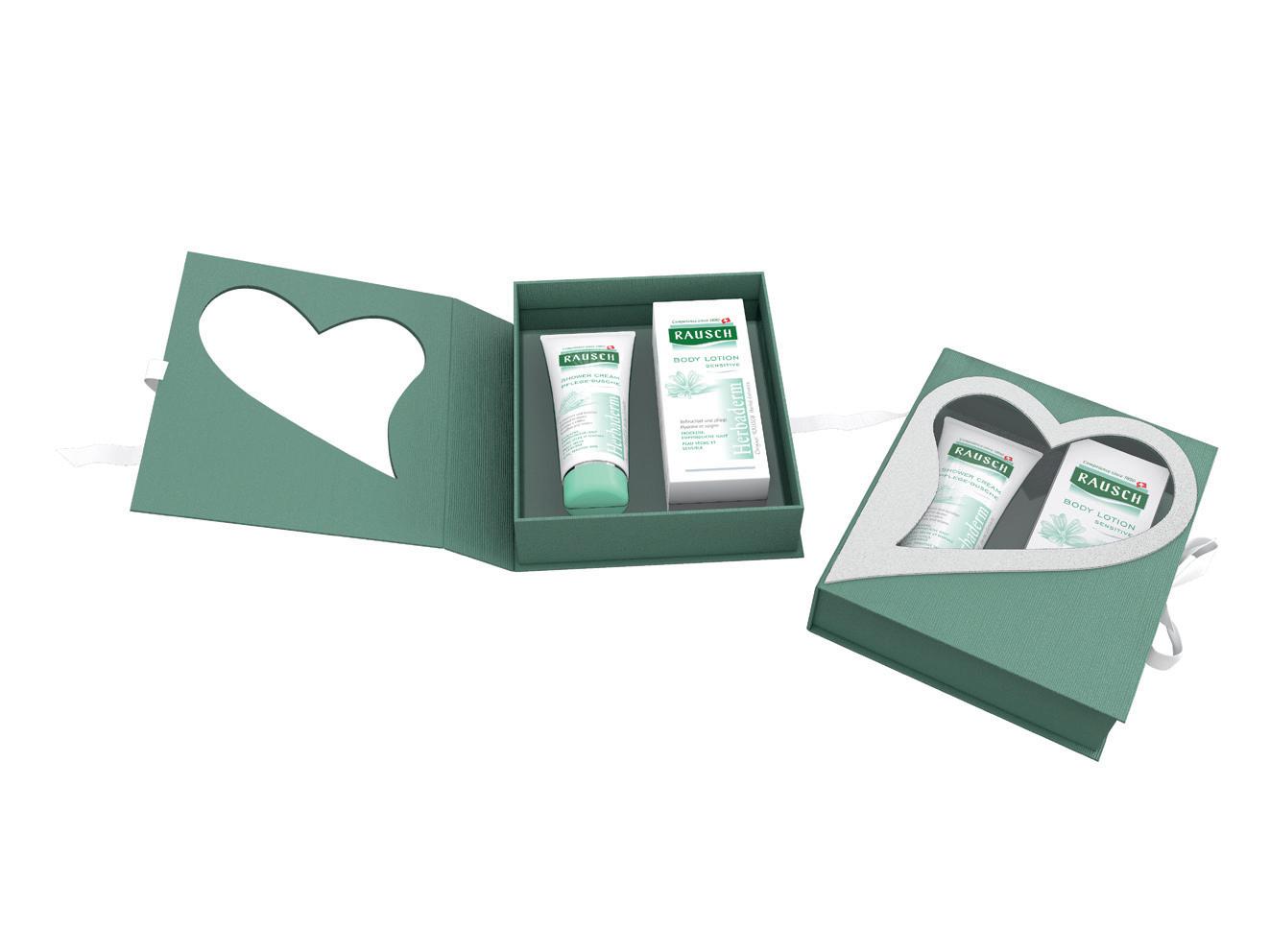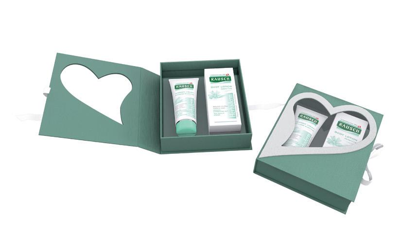 Jetzt gibt es von RAUSCH ein Pflegeduo für trockene, empfindliche Haut. Die SHOWER CREAM Pflege-Dusche auf Basis von Weizenkleie, Schachtelhalm und Kamille mildert Spannungsgefühle und beruhigt. Die BODY LOTION SENSITIVE mit Weizenkleie, Malve und Kamille spendet der Haut Feuchtigkeit und schützt sie nachhaltig. Die exklusiv gestaltete Aufbewahrungsbox hat ein Sichtfenster in Herzform und lässt sich an der Seite mit einer Schleife schliessen. www.rausch.ch