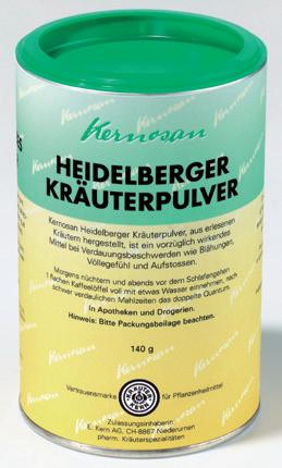 Kernosan Heidelberger Kräuterpulver wird nach dem Rezept von Bertrand Heidelberger aus erlesenen, pulverisierten Kräutern ohne andere Beimischungen hergestellt. Es wird angewendet bei Verdauungsbeschwerden wie Blähungen, Völlegefühl und Aufstossen. Die sieben Kräuter sind alle bitter. Bitterstoffe sind wichtig für die Verdauung und den Abbau von Schleim und Schlacken und wirken daher blutreinigend. Leber und Nieren werden entlastet. Zudem stärken die natürlichen Bitterstoffe das Abwehrsystem und haben auch eine anti-oxydative Wirkung. Aggressive Sauerstoffmoleküle werden abgefangen und die Zellen vor einer Schädigung bewahrt.
