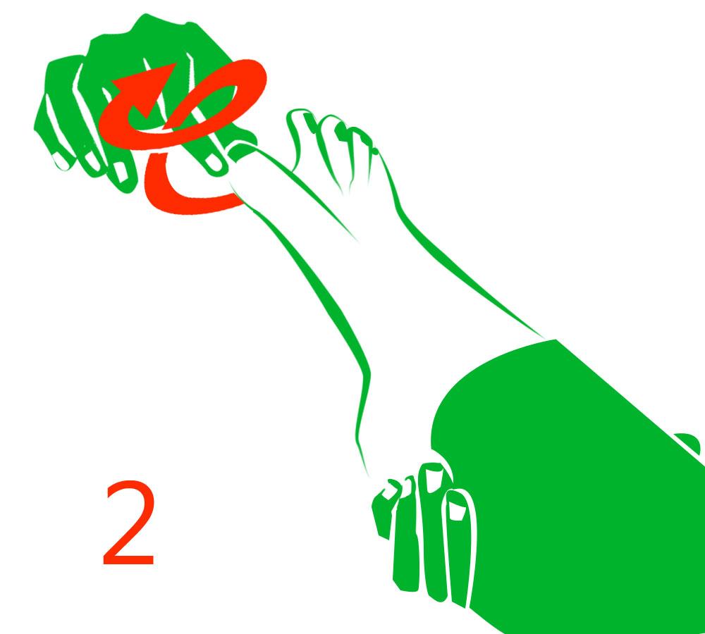 In einem nächsten Schritt ziehen Sie einige Male ganz leicht an der Zehe, um anschliessend eine leichte Drehbewegung hinzuzufügen, so wie wenn Sie eine Flasche entkorken würden (Abbildung 2). Vorsichtig, langsam und mit kleinen Bewegungen. Zum Schluss bewegen Sie die zwei Gelenke der grossen Zehe einzeln etwas auf und ab.
