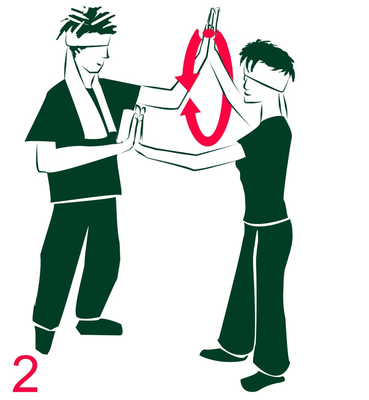 1 I Führen Sie Ihre Hände nun weiter nach vorne, bis Sie diejenigen Ihres Partners berühren. Nehmen Ihre Hände die andern Hände wahr oder merken Sie, dass sich auf den Ihren ein anderes Paar befindet? Ist es also eine aktive oder eine passive Berührung?