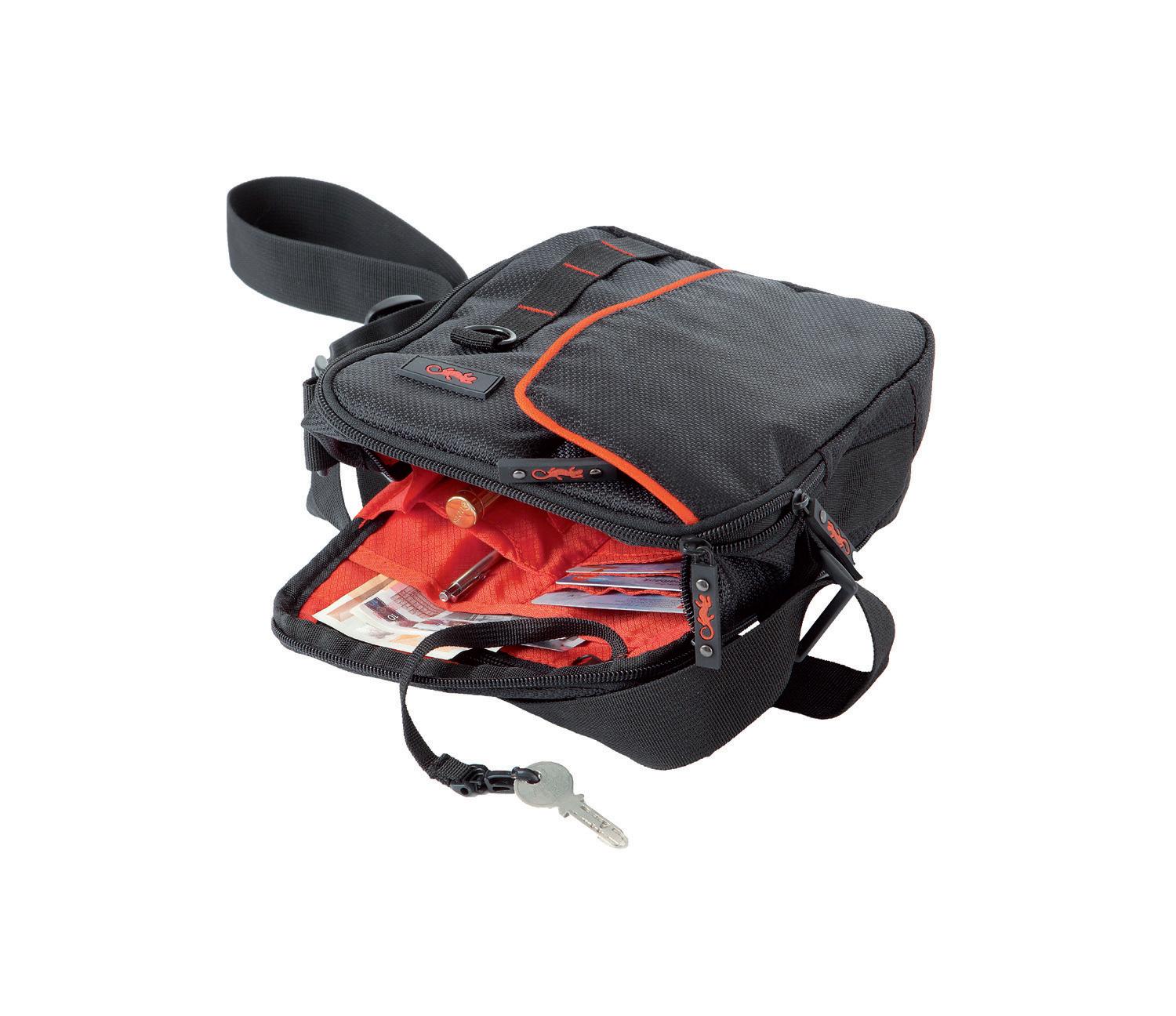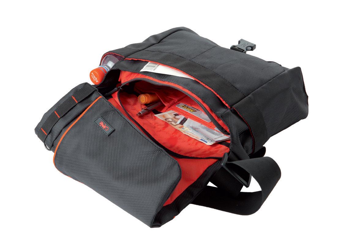 Aussenfach vor ne mit verschliessbarem Innenteil, Ticketfach vor ne und 4 Anhängeschlaufen.