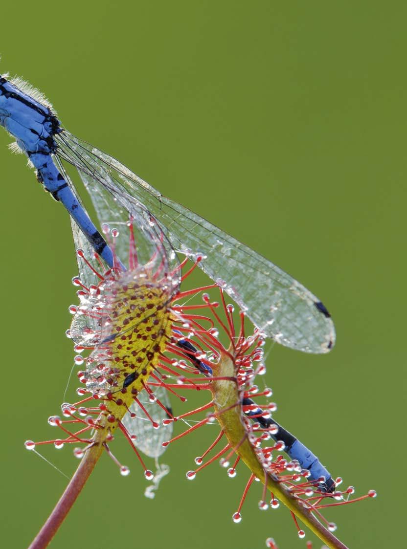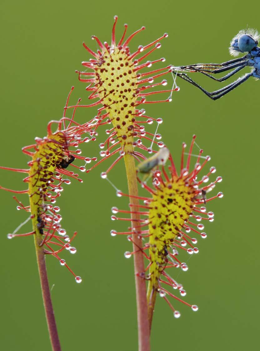 Eine Hufeisen-Azurjungfer, selber gefürchtete Jägerin, fällt einem Rundblättrigen Sonnentau ( Drosera rotundifolia ) zum Opfer. Die eischfressende P anze ist selten geworden und schwer zu nden. Eine wahre Überlebenskünstlerin in Mooren und Heiden.