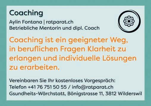 Verwöhnung mit einem hauch von Luxus: Handmassage mit feuchtigkeitsspendender Lotion & ätherischem Rosenöl, danach eine Maske mit Rosenblättern und zur Entspannung eine Tasse Rosentee! Dauer ca. 1 ½ Std. Fr. 69.– (statt Fr. 80.–) Hauptstrasse 47, 3800 Unterseen, Tel. 033 821 16 00 www.kosmetik-harmonie.ch Gültig bis 30.11. 2022 –bitte Inserat mitbringen. Manicure mit Rosen-Maske W der Herb RESTAURANT ZUM Ein Bereich der SEEBURG -Gruppe Interlaken www.seeburg.ch RESTAURANT ZUM CHOCHTOPF JUNGFRAU HOTEL Schulgässli 51 3812 Wilderswil T 033 845 85 00 info@chochtopf.ch www.chochtopf.ch Hirs p er Bünd rart LASSEN SIE SICH VON UNSEREN KREATIONEN BEGEISTERN Apotheke Dr. Portmann AG Höheweg 4, 3800 Interlaken Tel. 033 828 34 34, www.portmann.ch Mobil sein Hygienebeutel Toilettenstuhl