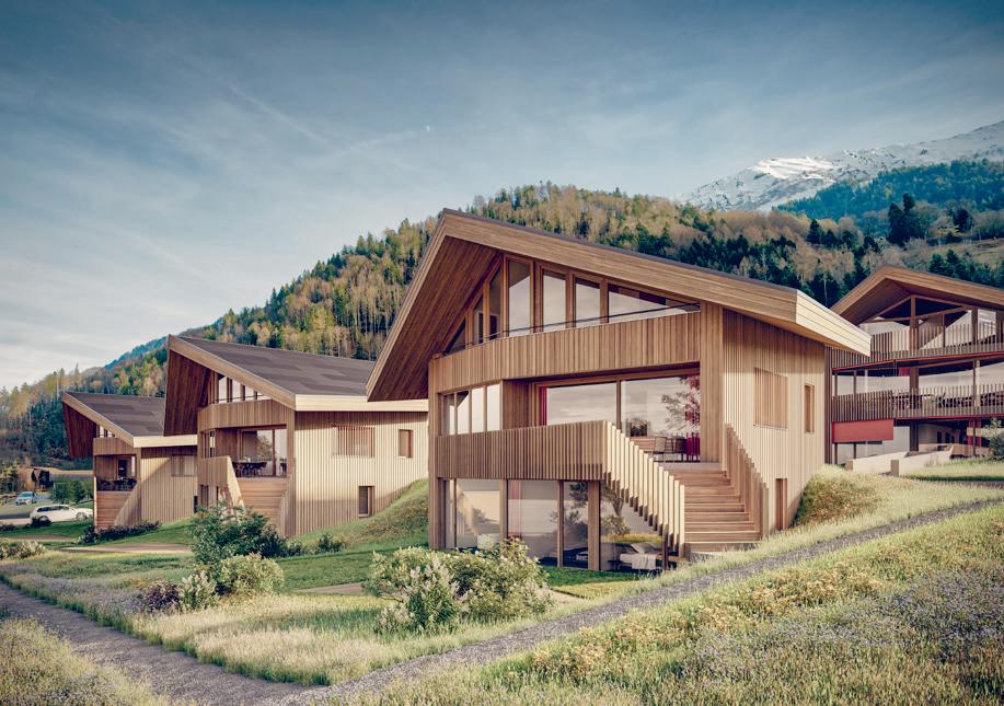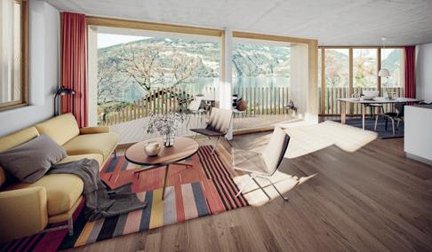 See. Für die künftigen Bewohner ist ein breit gefächertes Wohnungsangebot an Eigentumswohnungen vorhanden. Die Materialien widerspiegeln die Überzeugung des Architekten von der Verwendung natürlicher und sichtbarer Baumaterialien. Die Anwendung von Holz und Sichtbeton in einer zeitgerechten Ausführung ist sowohl innen wie auch aussen spürbar.
