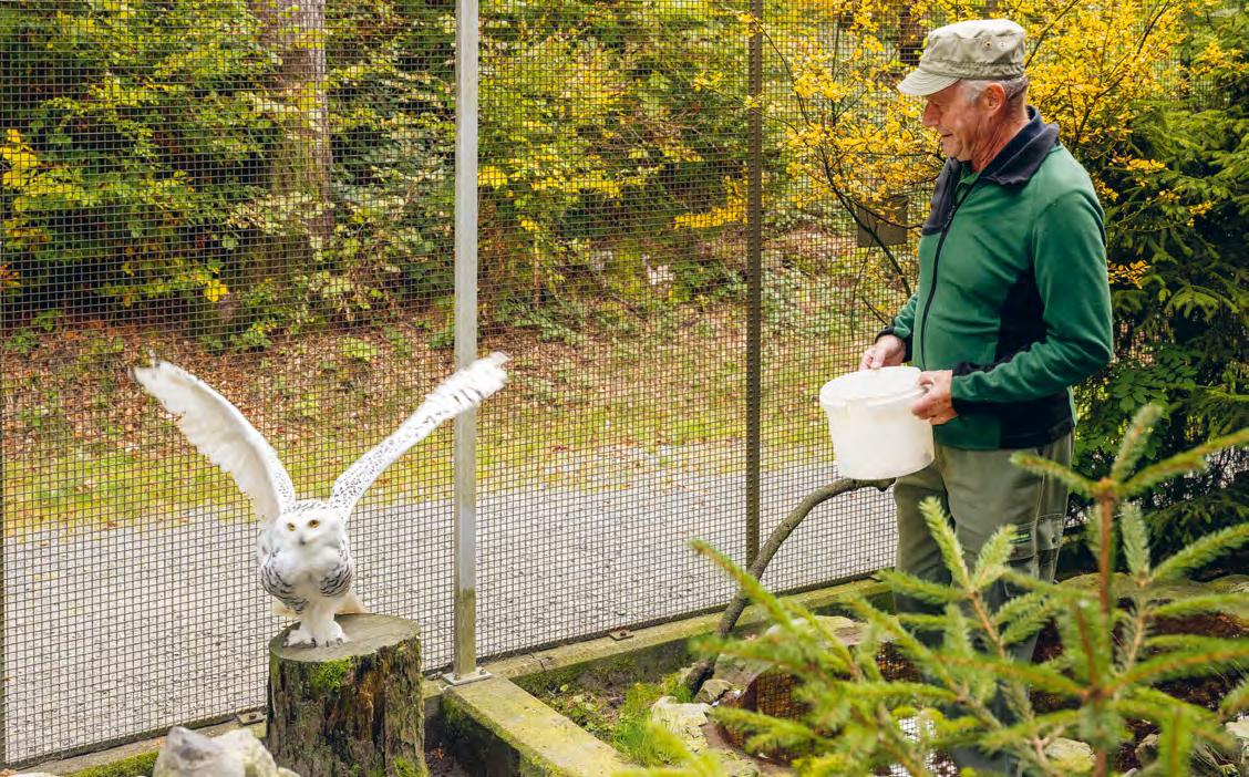 Bei uns leben Rothirsche, Gämsen, Steinwild (Böcke und Geissen), Murmeltiere, Schneeeulen aus der Tundra, ein Steinkauz, Jagdfasane – gerade haben wir acht Jungtiere – und Mandarinenten. Viele Tiere werden hier im Park geboren und wachsen bei uns auf.