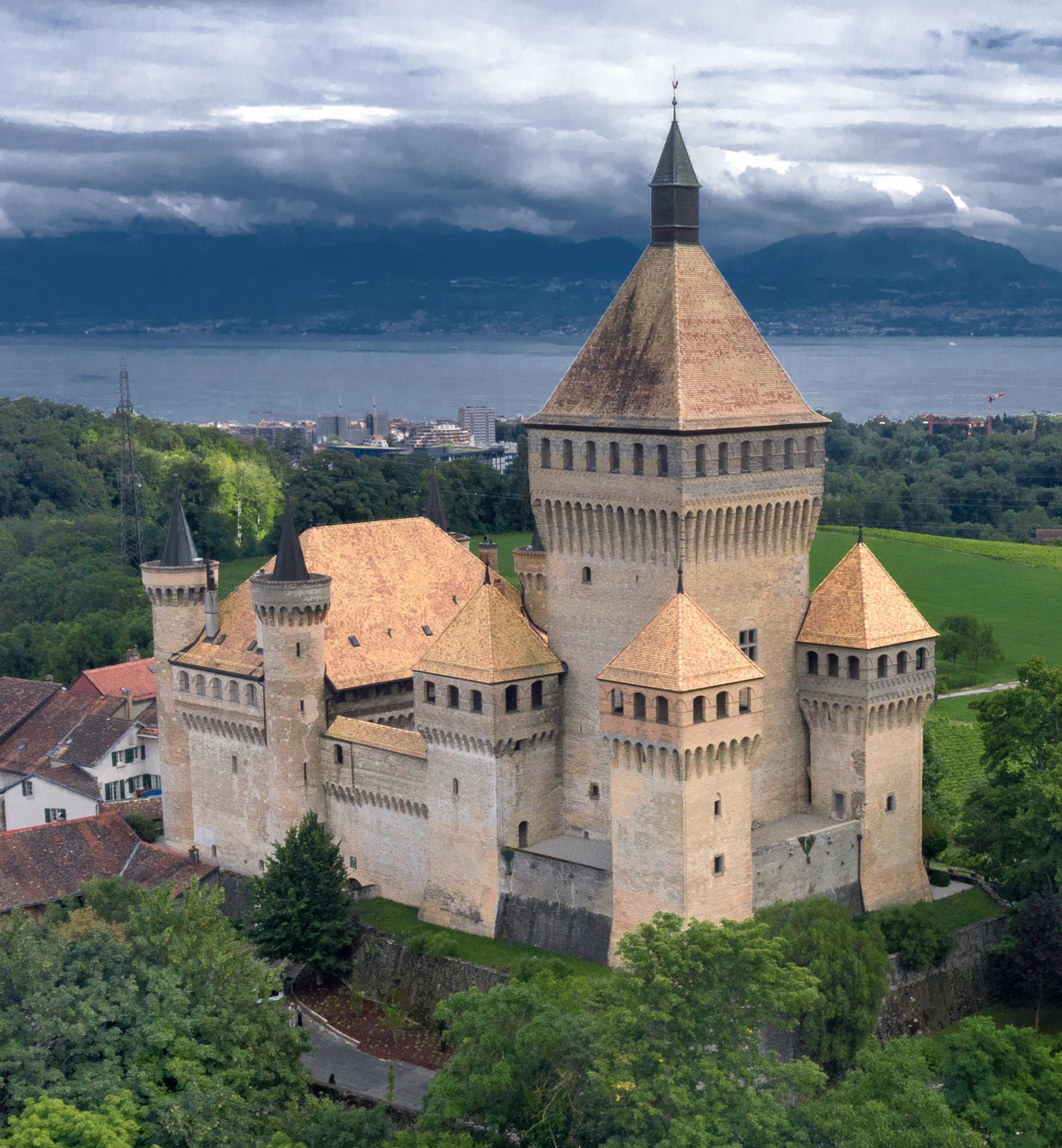 Aus Colombier stammend, einem Dörfchen nördlich von Morges, heute Gemeinde Echichens, liess Henri in den Jahren zwischen 1415 und 1430 die gewaltige Burganlage errichten. Mit all den Nebengebäuden, Gräben, Wällen und Umfassungsmauern war sie früher wohl noch viel eindrücklicher, doch auch so sind die über 2000 Quadratmeter Gebäudefläche beachtlich genug. Die gewaltige Burganlage von Vufflens erhebt sich, von weither sichtbar, auf einem sanften Hügel einige Kilometer nordwestlich von Morges. Sie besteht im Wesentlichen aus drei Bereichen: dem Westteil mit seinem alles überragenden, 55 Meter hohen und 144 Quadratmeter umfassenden Bergfried inmitten eines viereckigen Berings mit Ecktürmen, einem grosszügigen Hof, Eingang und Verbindung zwischen West- und Ostteil, dem Palas oder Wohntrakt, auch er von Mauern und Türmen eingefasst. Der heute weitgehend ungenutzte Bergfried besteht aus einem Keller, einer riesigen Küche, einem Saal und dem eigentlichen Turmbau, der offenbar nie ausgebaut worden ist. Der Ostteil, im 19. Jahrhundert innen völlig umgestaltet, enthält auf verschiedenen Etagen die elegant eingerichteten Wohn- und Schlafräume der Herrschaft. Von einer grossen, nach Süden ausgerichteten Terrasse hat man einen phantastischen Blick auf eine liebliche, von Rebbergen bestückte Landschaft mit dem gewaltigen Mont Blanc im Hintergrund.