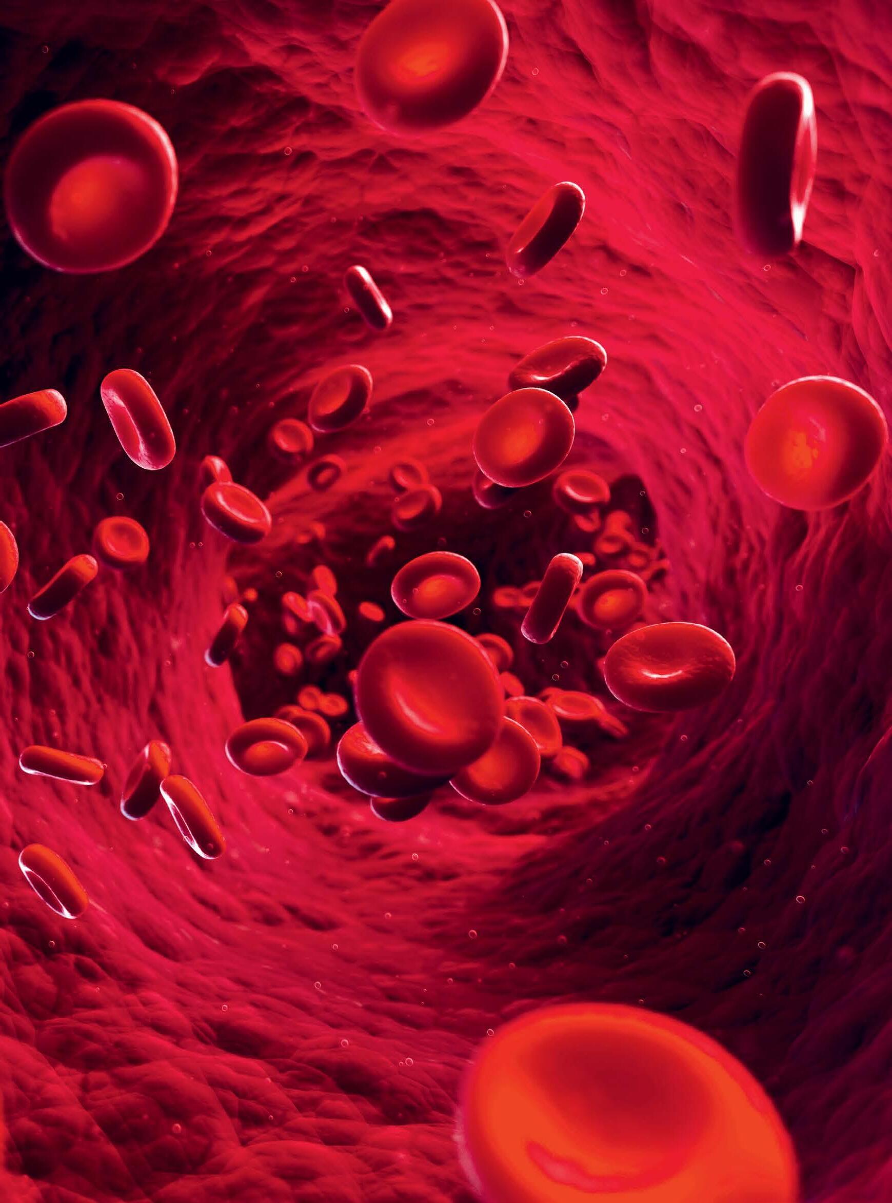 Rund fünf bis sechs Liter Blut fliessen durch ein feines Netz an Blutgefässen, das ungefähr 96 000 km lang ist und jede einzelne Zelle des Körpers miteinander verbindet. Die rote Flüssigkeit ist ein liquides Organ, das sich aus mehreren Bestandteilen zusammensetzt. Fast 50 Prozent davon ist Blutplasma, das vorwiegend Wasser enthält, 43 Prozent besteht aus roten Blutkörperchen (Erythrozyten), 2 Prozent machen die Blutplättchen (Thrombozyten) aus und 0,07 Prozent des Blutes bilden die weissen Blutkörperchen (Leukozyten). Der Rest sind Salze, Eiweiss, Fett und Zucker.