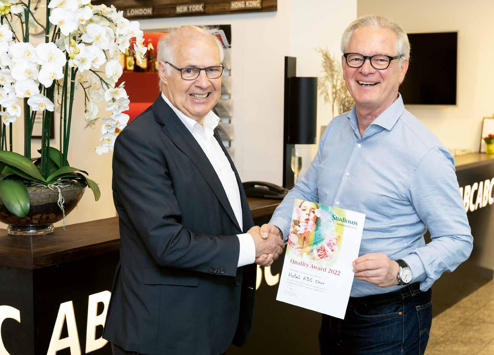 Die Studiosus Reisen – einer der grössten Kultur und Studienreiseveranstalter –vergibt einmal jährlich den Studiosus Quality Award. Von weltweit 2000 Partnerhotels wurden 2022 nur 27 Hotels ausgezeichnet. Es sind jene Hotels, mit denen über 95 Prozent der StudiosusReiseteilnehmenden zufrieden waren. In der Schweiz erhielt das Hotel ABC in Chur diese Auszeichnung der obersten Klasse.