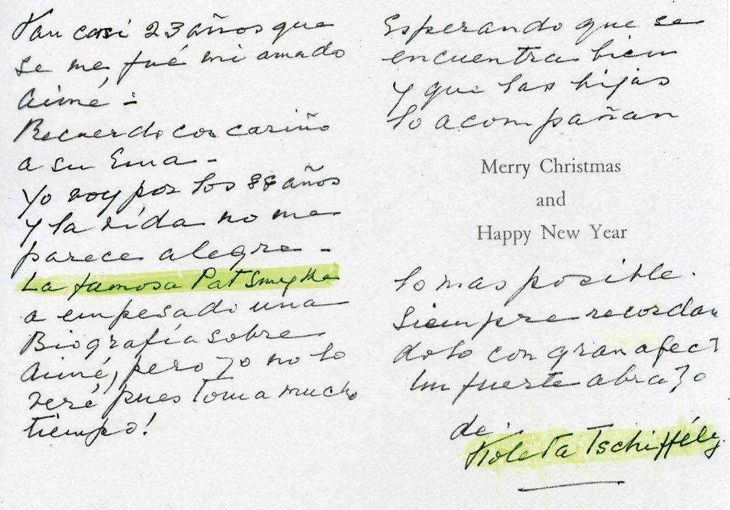 «Die berühmte Pat Smythe hat eine Biografie meines geliebten Aimé begonnen, aber ich werde sie nicht mehr sehen, denn es wird lange dauern. […]» © Violeta Tschiffely; Archiv El Cardal