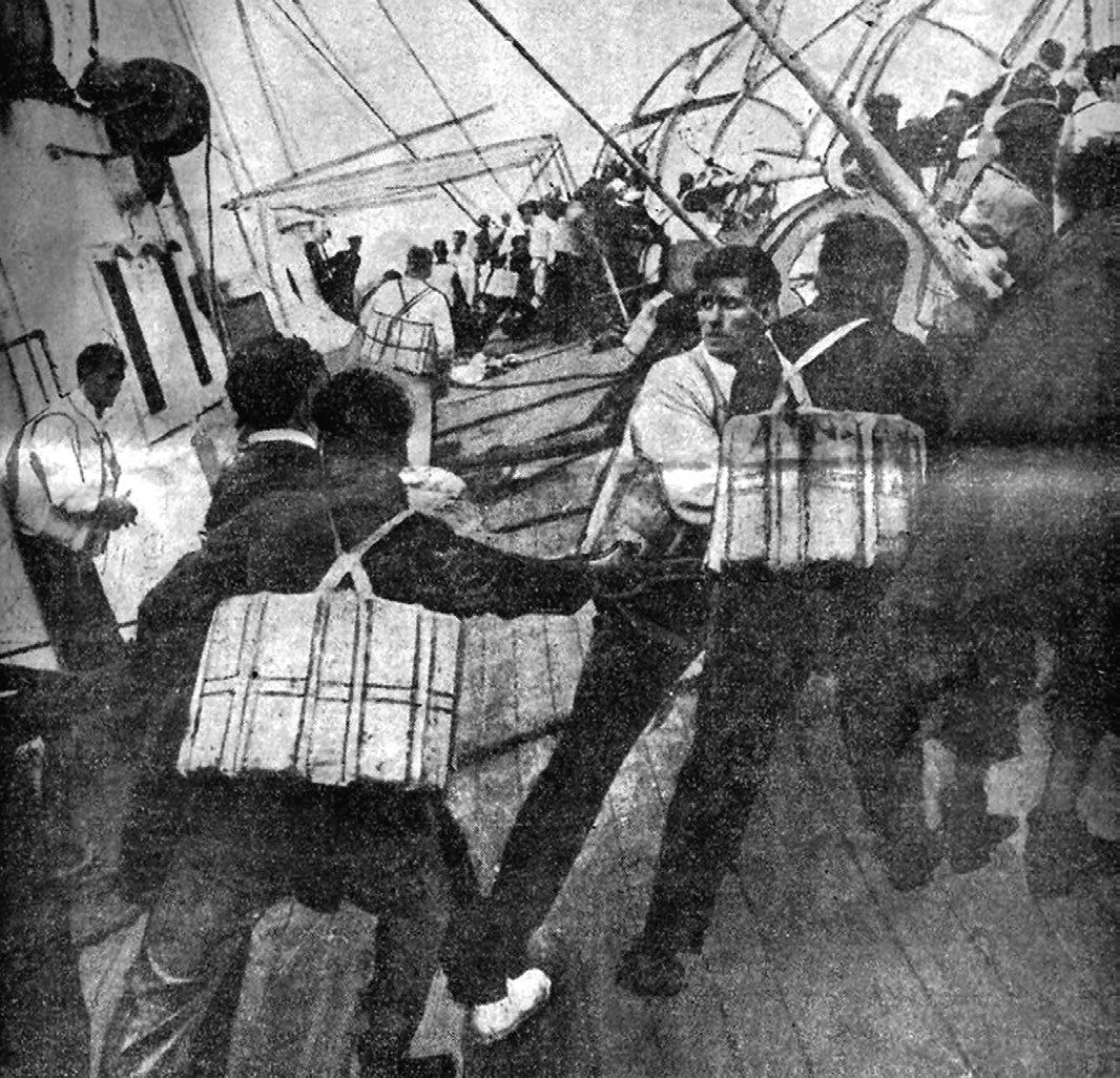 The Baltimore News, 15. November 1928. Gemäss der Zeitung eines der dramatischsten Bilder des Unglücks; es zeigt Passagiere auf dem Schiff, das bereits schwere Schlagseite hat, wie sie durch Umklammern der Hände eine Kette bilden und verzweifelt versuchen, ein Rettungsboot ins Wasser zu lassen