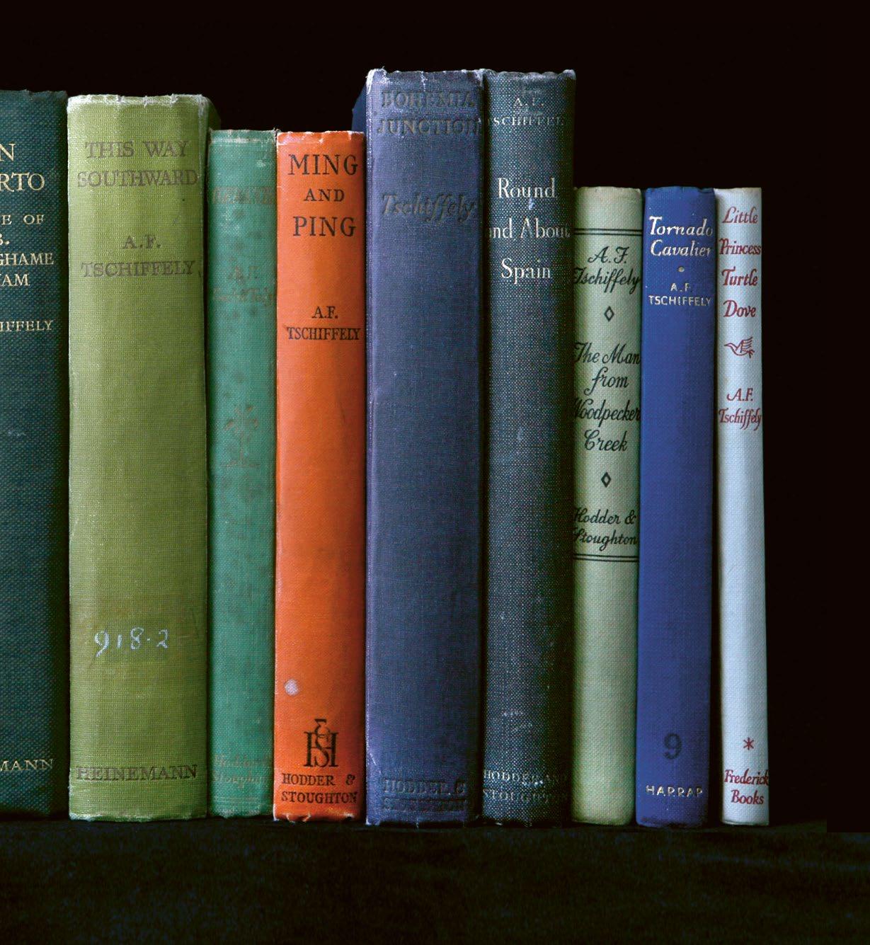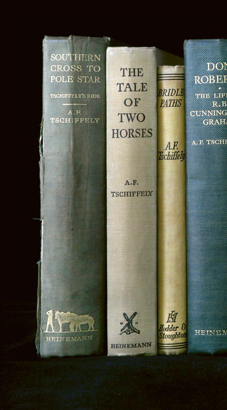 Tschiffelys Dutzend – die Bücher A. F. Tschiffelys, von links: «Southern Cross to Pole Star – Tschiffely’s Ride» (1933), «The Tale of Two Horses» (1934), «Bridle Paths» (1936), «Don Roberto» (1937), «This Way South ward» (1940), «Coricancha», (1943), «Ming and Ping» (1948), «Bohemia Junction» (1950), «Round and About Spain» (1952), «The Man from Woodpecker Creek» (1953), «Tornado Cavalier» (1955), «Little Princess Turtle Dove» (1957).