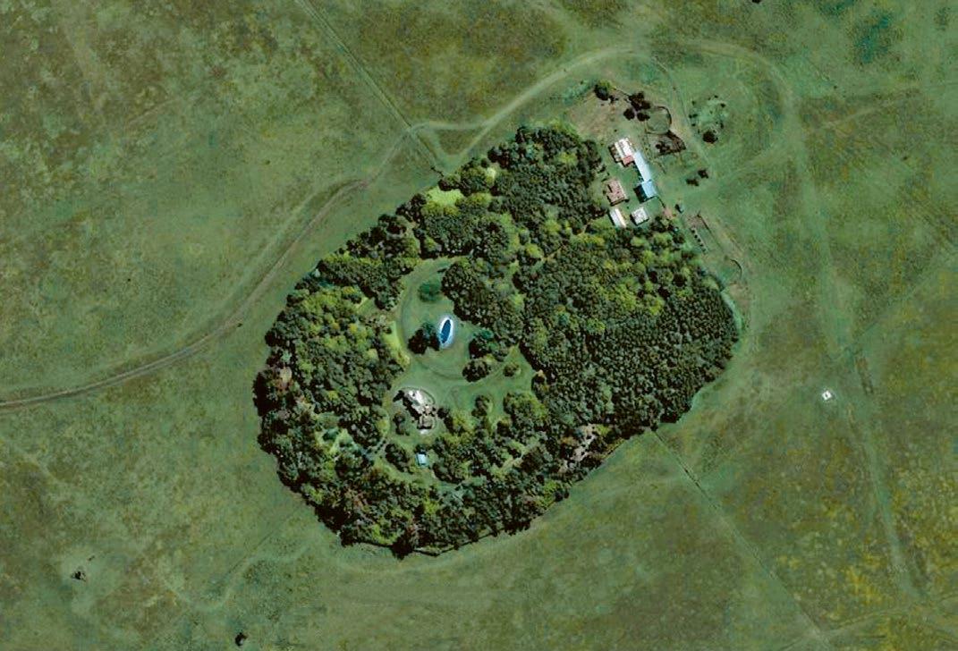 Luftaufnahme des Parks der Estancia El Cardal: Am oberen rechten Rand die Gebäude aus der Gründerzeit der 1880er-Jahre. Etwas südwestlich des in der Mitte erkennbaren Ringweges liegt das 1922 erbaute neue Wohnhaus (helles Dach). Die Tschiffely-Gedenkstätte befindet sich links der hellgrünen Fläche am oberen Rand des Parkes (siehe Kapitel 31, S.336). © Satellite image courtesy of Digital Globe