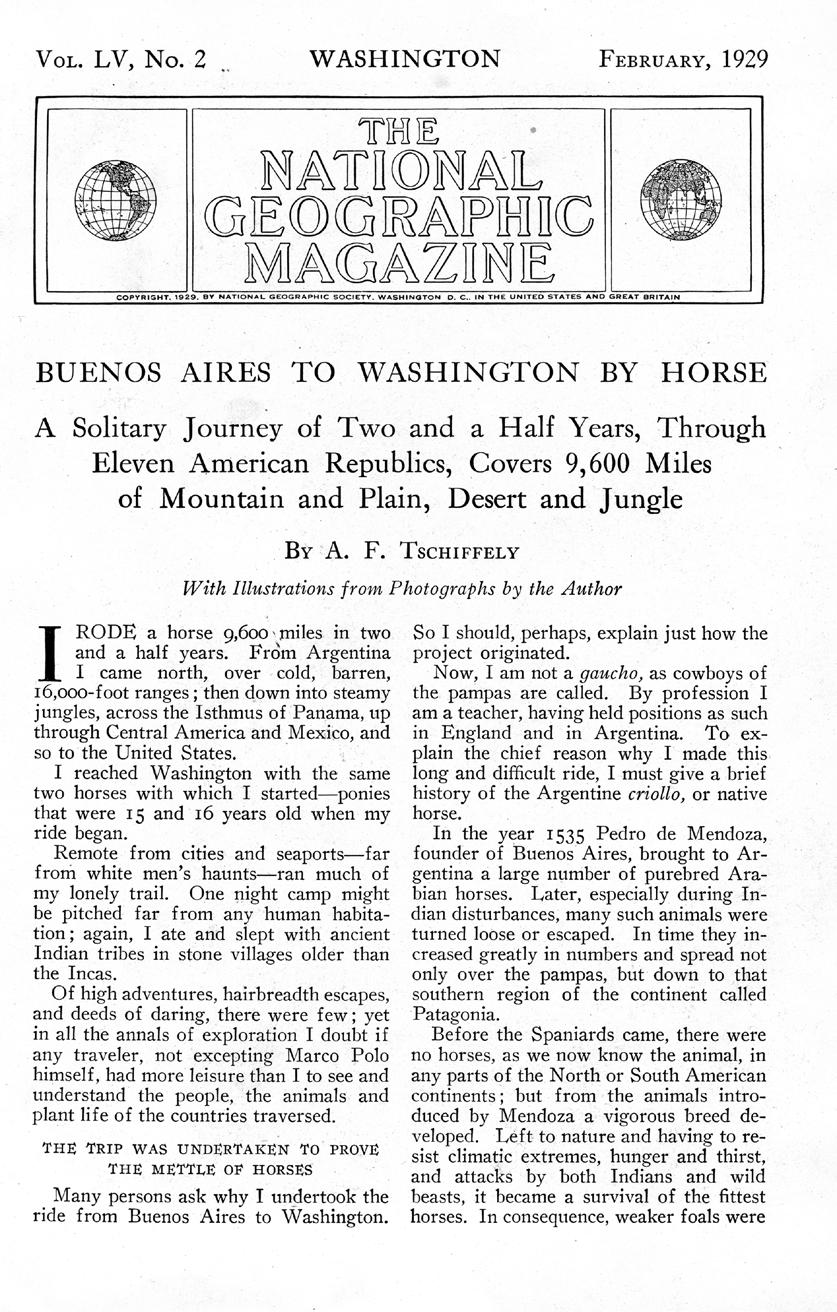 Erste Seite des Berichtes im National Geographic Magazine (aus unerklärlichen Gründen schreibt Tschiffely von einem Ritt von zweieinhalb anstatt dreieinhalb Jahren).