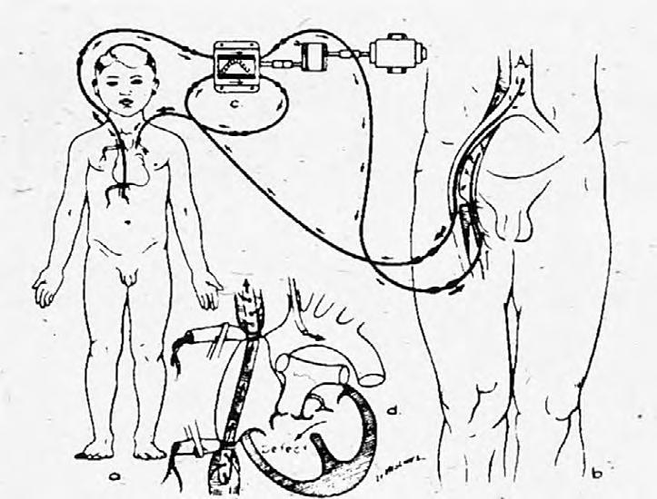 Anfang der Chirurgie am offenen Herzen. Zur Erhaltung der Kreislauffunktion beim Kind wird der Vater, resp. die Mutter über die Leistengefässe mit dem Kinderherzen verbunden. Zwischen dem Kind und den Eltern wird der Blutdruck reguliert.