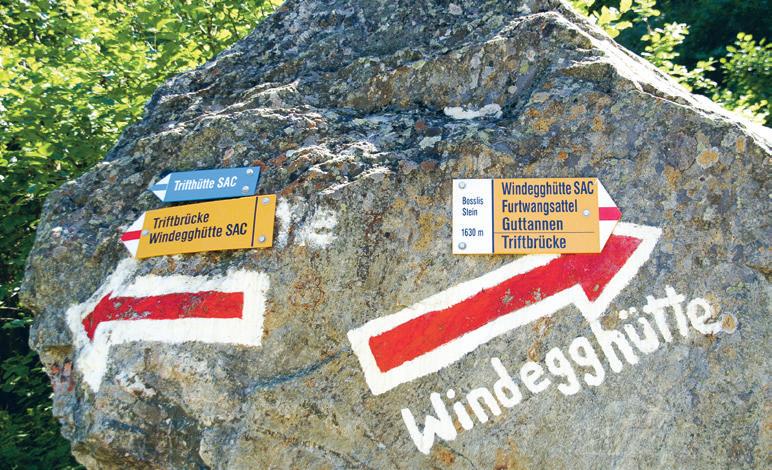 die Triftschlucht hinauf ins gleich namige Gletschertal bis Underi Trift. Gipfel mit seltsamen Namen wie Fläschen-, Mähren- oder Windegghorn stehen da beisammen; auch nicht gerade vertraut klingen Radlefshorn, Murwetestock und Graui Stöckli . Ein furioser Auftakt, die Fahrt hinein in diesen wilden Felsenkessel . Der Weg zur Windegghütte ist vorbildlich markiert, führt zunächst eben auf den Talboden, quert das Triftwasser und wechselt dann von der bewaldeten Ost- zur felsigen Westseite. Hier trifft man auf den Weg, der von Schwendi heraufzieht und steigt nun leicht, aber stetig bergan bis zum markanten Bosslis Stein . Drei Varianten führen ab hier zur Windegghütte, eine erste gleich rechts auf direktem Weg steil hinauf Nach links weist die Markierung zur Triftbrücke, in stetigem Auf und Ab über glatte Granitplatten Im Verlauf dieses Weges gibt es noch eine zweite, weniger steile Möglichkeit, um zur Hütte aufzusteigen, doch wenn die Kids die Hängeseilbrücke erspähen, kennen sie nur noch eine Richtung: geradeaus.