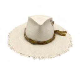 Handgewobener Hut aus Panamastroh mit ausgefranstem Rand, natürlich gegerbtem Lederschweissband und Innenfutter aus 100 % Seide. Die Krone ist mit Seide umwickelt und mit Edelsteinen verschönert, im Wert von Fr. 750.–.