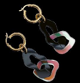 Inspiriert von zarten Geometrien und dem mütterlichen Ionischen Meer, kreiert Veronica Antonucci Accessoires in fluider Ästhetik. Die vergoldeten Kreolen Yule sind aus 925er Silber mit schwarzem und irisierendem Acrylglas. vanto.ch