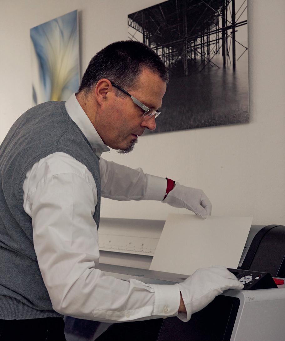 Früh erkannte Bernhard Zumbrunn seine Leidenschaft für Drucke. Nach seiner Lehre als Tiefdruck-Farbenretuscheur und der Umschulung zum Lithografen gründete er vor nunmehr 20 Jahren «imaprint». Die Dunkelkammer braucht es heute zwar nicht mehr, um Bilder zu entwickeln, jedoch ähnlich viel Detailwissen. Dieses setzt Peter Brechbühl, der die Firma 2011 übernahm, täglich für makellose und veredelte Fine-Art-Prints ein. Mit Akribie und Kenntnis der Materie bringt er selbst komplexe Sujets in sorgfältigen Druckverfahren auf die unterschiedlichsten Papiertypen auf. Die Papierwahl ist die Königsdisziplin, denn Dicke, Struktur und Farbwiedergabe beeinflussen das Resultat. Man müsse mit eigenen Augen sehen, was so ein Fine-Art-Print im Vergleich zu herkömmlichen Drucken leiste und erst deren Wirkung entfalte, findet der Colormanagement-Spezialist. Davon kann man sich zum Beispiel an der «Werkschau» überzeugen, für welche er die Bilder der anspruchsvollen Fotografen und Fotografinnen printet.