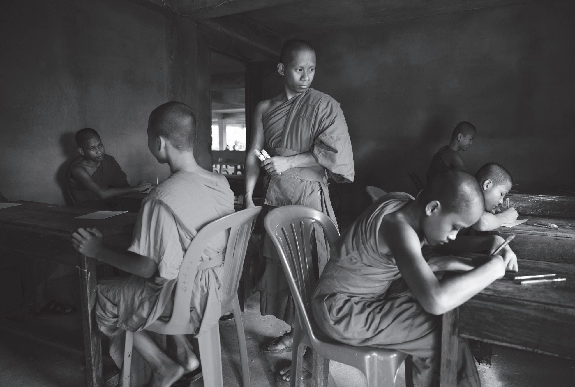 tern, die das Ähnliche noch gleicher machen – landet dann höchstens für 24 Stunden in der Story. In Zeiten von Bist-duwas-knipst-du-das wirkt die Ausstellung «Werkschau» geradezu als Gegenpol, der das Verständnis von Fotografie als Kunst im Denkapparat scharfstellt. Natürlich landen Schnappschüsse der Ausstellungsstücke mal in einer Story, aber dies ist nicht deren Endbestimmung, sondern höchstens Nebenschauplatz: Die Werke erzählen Geschichten, die erhaben sind über die klickbissige Kurzlebigkeit. So ist es keine Instantangelegenheit, sondern eine des Innehaltens, sich in das Leben der Theravada-Mönche einzufühlen: In Kampot im Süden Kambodschas hat der Zürcher Fotograf und Filmemacher Steff Gruber den Alltag buddhistischer Mönche im Kloster dokumentiert. Im Kontrast zur aus dem Leben gegriffenen schwarz-weiss Reportage stehen die im